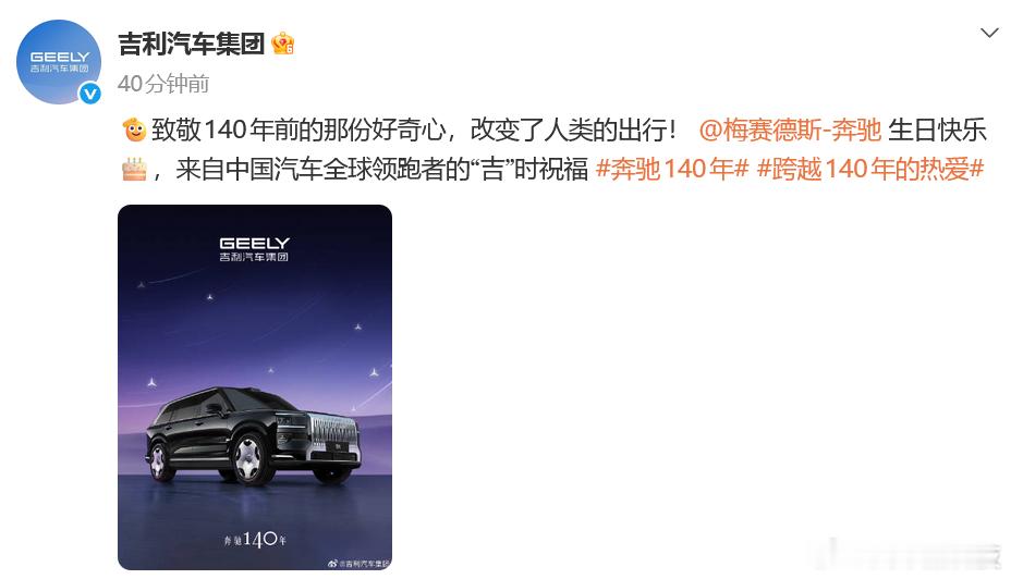 吉利汽车祝奔驰140岁生日快乐 吉利汽车祝贺奔驰140岁生日快乐,这个必须的祝贺一下,毕竟是大股东 今天是奔驰140岁生日 奔驰140年跨越140年的热爱