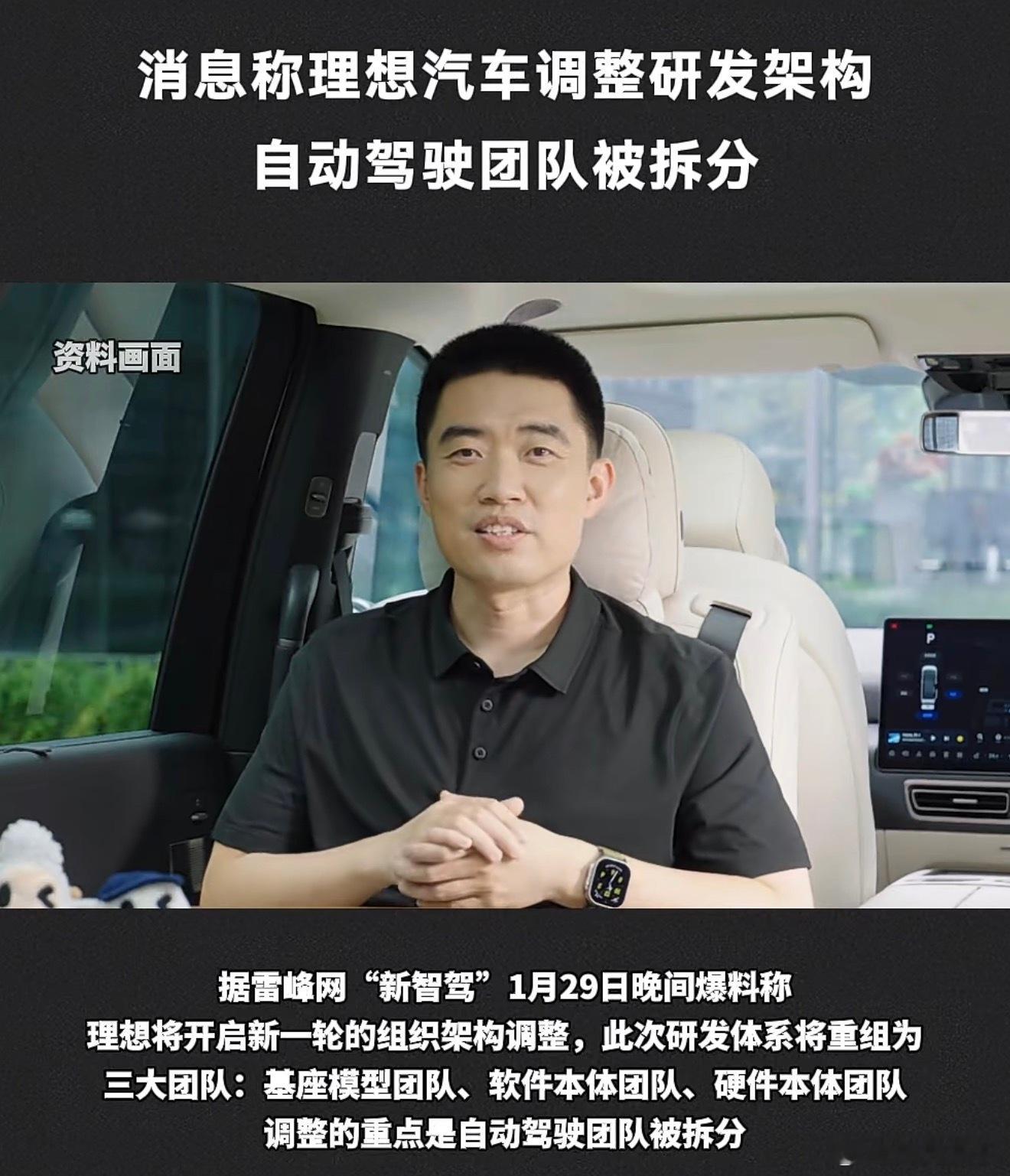曝理想调整研发架构理想汽车将研发体系重组为三大团队:基座模型团队、软件本体团队、硬件本体团队,这次调整的重点是自动驾驶团队被拆分。部分职能并入软件团队,部分转向机器人研发。原自动驾驶高级副总裁郎咸朋转岗负责,理想也开始重投机器人领域了。曝理想调整研发架构