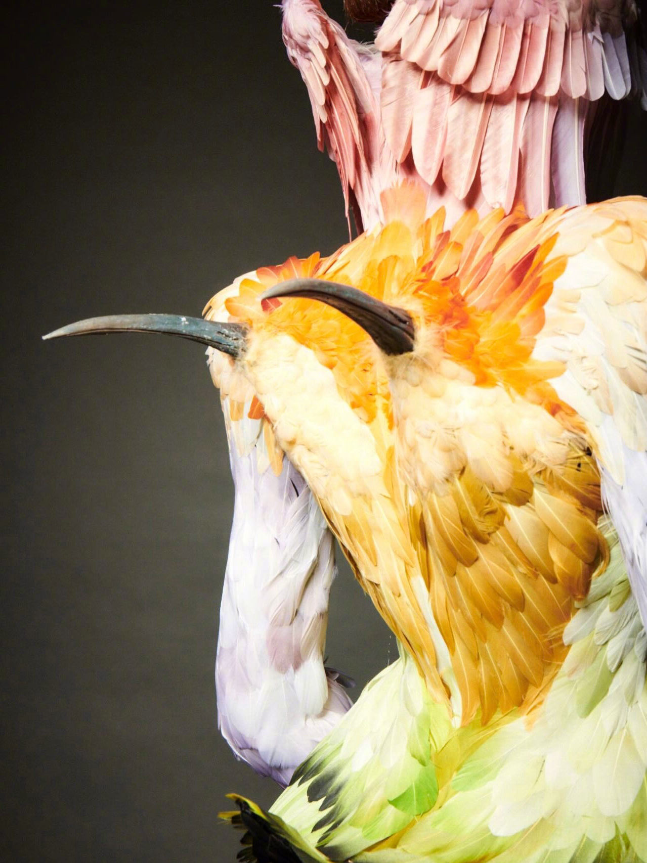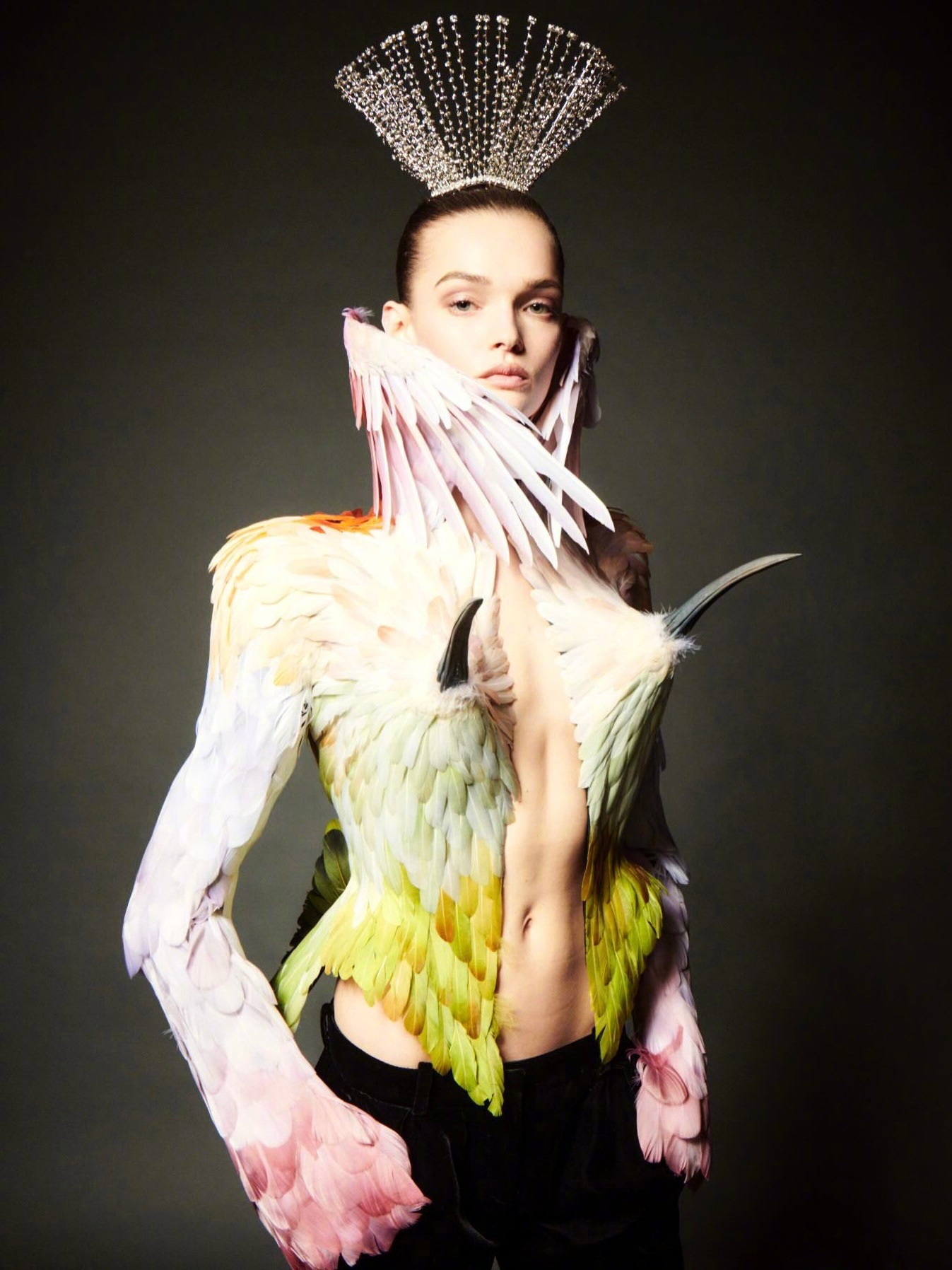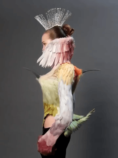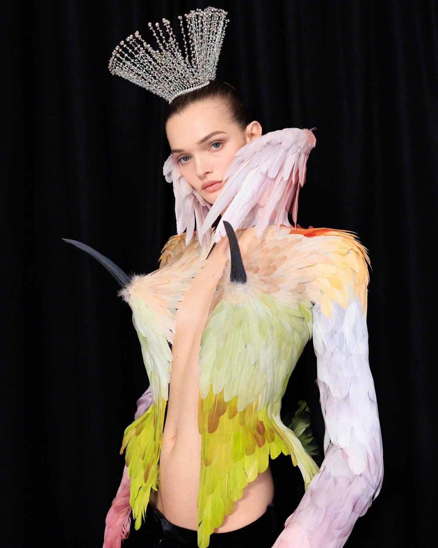 Schiaparelli S/S 2026 Haute Couture 🦜巴黎高定时装周 欧根纱打造的Elsa夹克以利落肩线塑造挺阔廓形,反重力臀部设计大胆鲜明;翼形领口以数千枚手工绘制的烟雾渐变羽毛刺绣呈现,色彩由开心果绿延展至珊瑚色与震撼粉;四枚手工雕塑立体鸟喙点缀其间。搭配银色水钻太阳造型头饰,营造不凡气场。由模特Lulu Tenney演绎,完美契合“愤怒与狂喜”主题。大秀直击