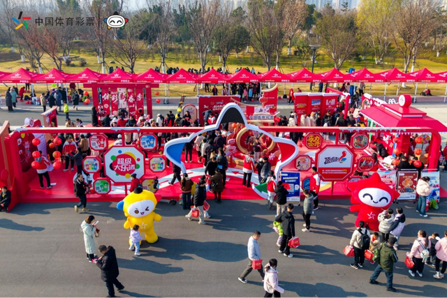 与此同时,作为赛事的配套活动,由安徽省体育彩票管理中心合肥分中心主办的“2026年体彩新春季新春贺岁市集”也热闹开锣。步入市集,满眼的中国红,让人一下子有了新年仪式感,节日的喜庆也扑面而来。入口处乐小星主题门头活泼醒目,正面集中展示体彩超级大乐透、顶呱刮等明星产品,背面清晰标注了公益金提取比例及用途——“每一注大乐透彩票其金额的36%用于助力社会公益事业和体育事业”。