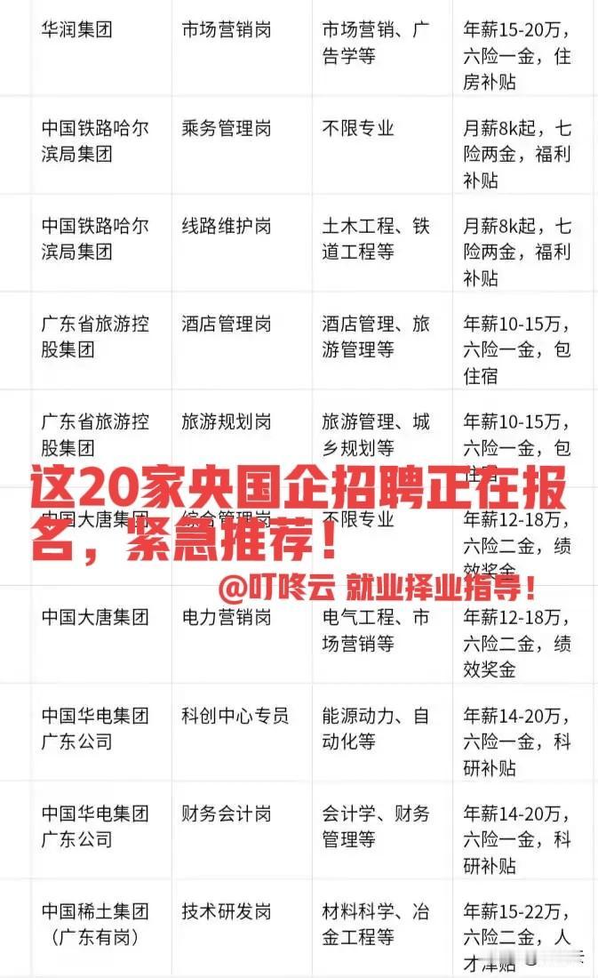 即将截止,正在报名!20家央国企招聘要求及薪资待遇汇总揭秘!紧急报名,窗口集中在1月~2月!中国远洋集团、中国铁路广州局、华润集团等等企业招聘汇总!岗位和薪资待遇揭秘。速速收藏起来备用![点亮平安灯][点亮平安灯][福][福] 欢迎关注@叮咚云 将优先为粉丝职业规划指导,为你定制最适合的就业择业方案!欢迎留言交流讨论。[来看我][来看我] 免责声明:图片来自网络,仅供参考!