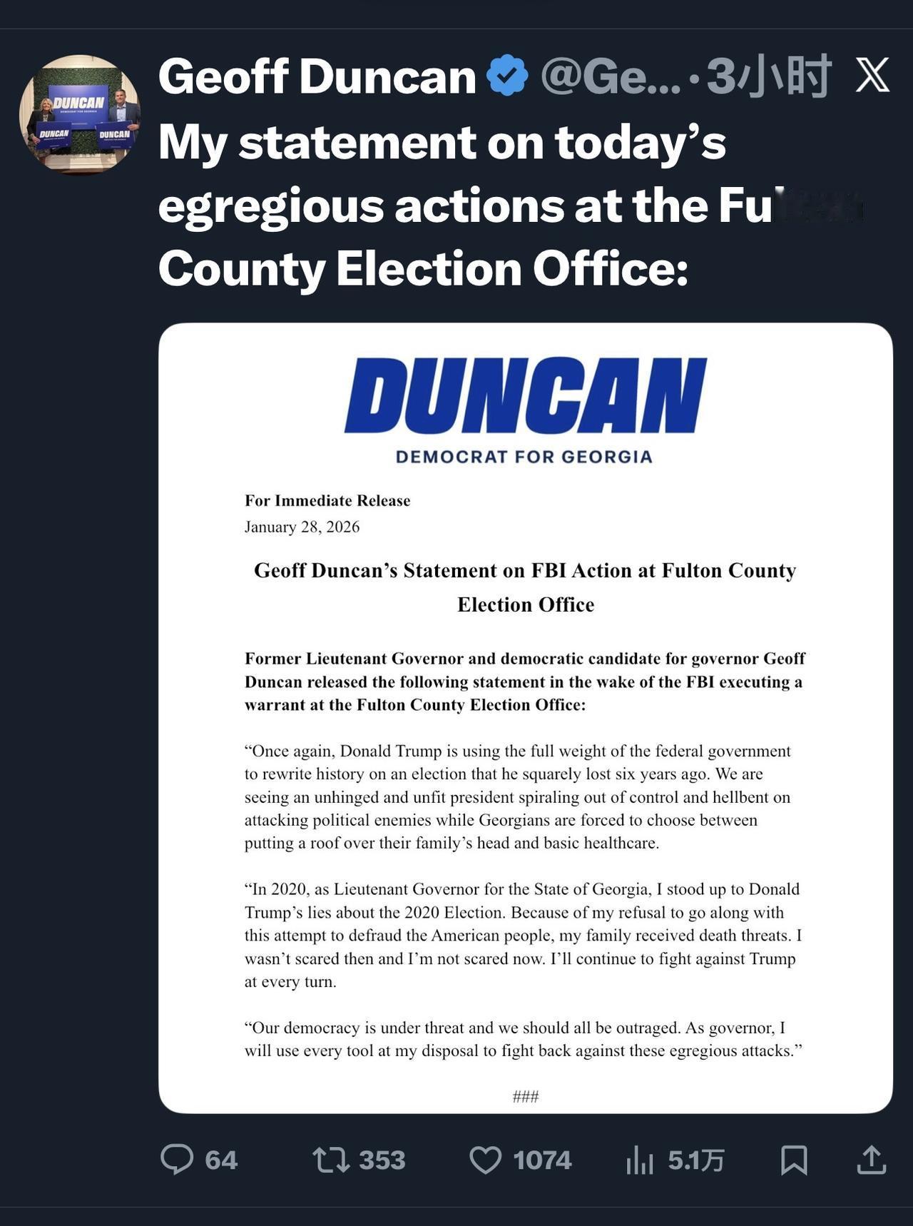 美国乔治亚州前副州长兼民主党州长候选人杰夫•邓肯在联邦调查局于富尔顿县选举办公室执行搜查令后,发表了以下声明: “唐纳德•特朗普再次利用联邦政府的全部力量,在一个他六年前就明确败选了的选举上改写历史。我们正目睹一位精神错乱、不称职的总统逐渐失控,一心一意要攻击政治对手。与此同时,乔治亚州的民众却被迫要在为家人提供住所和基本医疗保障之间做出选择。” “2020年,作为乔治亚州的副州长,我勇敢地揭穿了唐纳德•特朗普关于2020年大选的谎言。因为我拒绝参与这场企图欺骗美国人民的行动,我的家人收到了死亡威胁。我当时并不害怕,现在也不害怕。我将继续在各个场合与特朗普作斗争。” “我们的民主正面临威胁,我们都应感到愤怒。作为州长,我将动用手中一切工具来反击这些恶劣的攻击。”