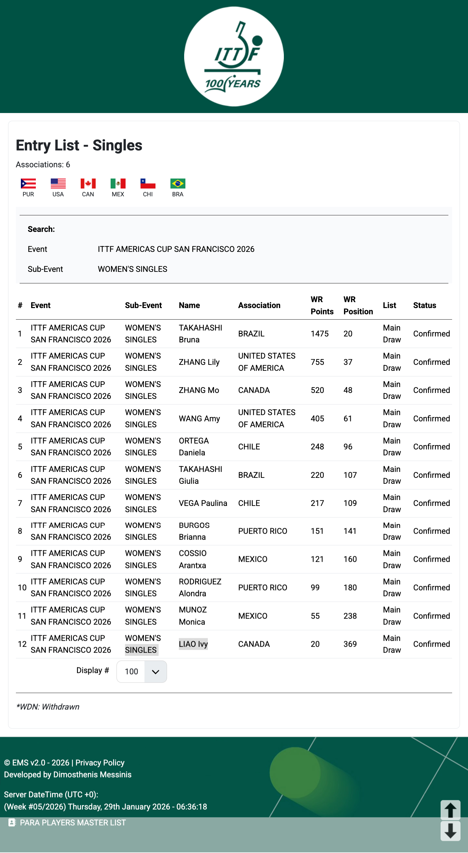2026乒乓球美洲杯丨赛事信息【比赛时间】预赛1.28-1.29正赛1.30-2.1丨旧金山·美国🇺🇸【参赛名单】男单正赛丨雨果·卡尔德拉诺🇧🇷、卡纳克·贾哈🇺🇸、王臻🇨🇦、奥拉西奥·西福恩特斯🇦🇷、尼古拉斯·博格斯🇨🇱、李元璋🇨🇦、古斯塔沃·戈麦斯🇨🇱、希德·纳雷什🇺🇸、罗格里奥·卡斯特罗🇲🇽、吉列尔姆·特奥多罗🇧🇷、安吉尔·纳兰霍🇵🇷、泰瑞斯·奈特🇧🇧女单正赛丨高桥·布鲁娜🇧🇷、张安🇺🇸、张墨🇨🇦、王艾米🇺🇸、丹妮拉·奥尔特加🇨🇱、高桥·朱丽叶🇧🇷、波琳娜·维加🇨🇱、布丽安娜·布尔戈斯🇵🇷、阿兰特萨·科西奥·阿塞维斯🇲🇽、阿隆德拉·罗德里格斯🇵🇷、莫妮卡·穆尼奥斯🇲🇽、廖桂华🇨🇦【赛制】将分为预赛和正赛两个阶段预赛使用淘汰赛制,进入4强的选手将晋级正赛阶段,五局三胜制(比赛进行中)正赛淘汰赛签表将包括12位受邀选手+4位预赛晋级选手,七局四胜制