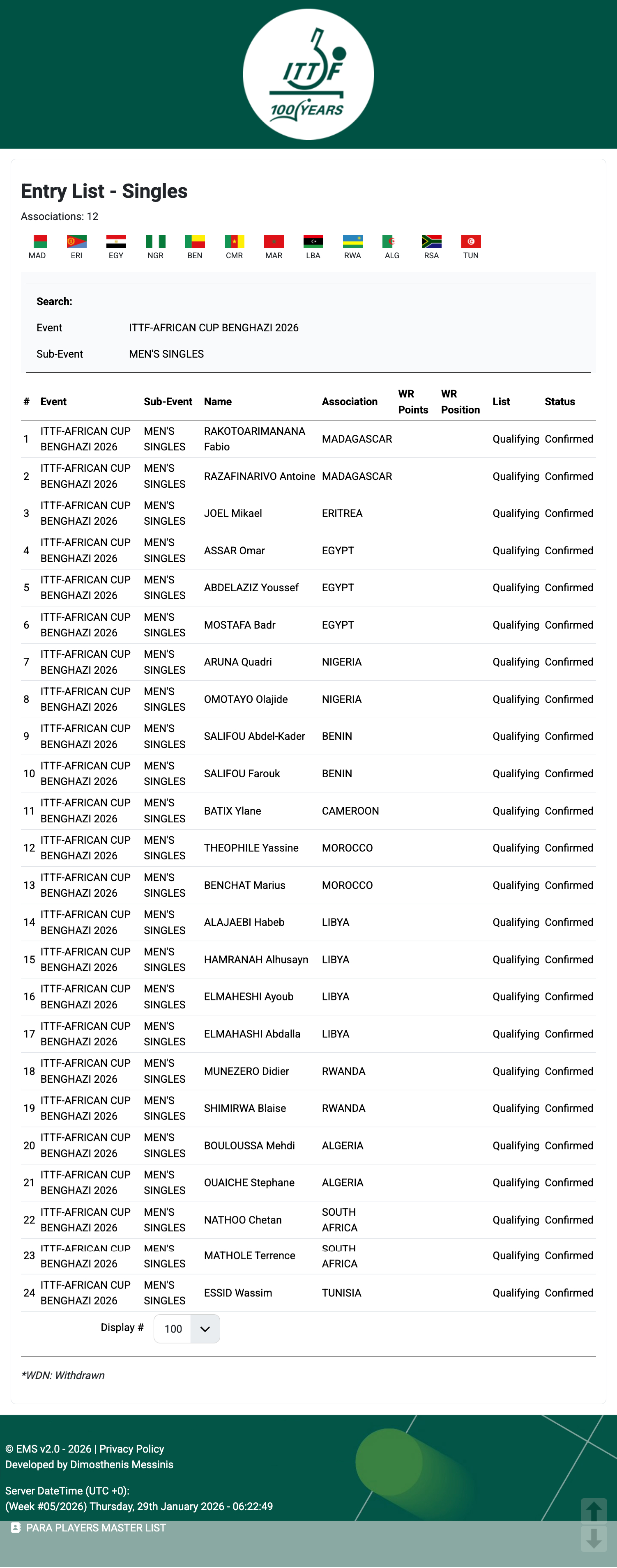 2026乒乓球非洲杯丨赛事信息【比赛时间】2.7-2.9丨利比亚·班加西🇱🇾【参赛名单】男单丨奥玛·阿萨尔🇪🇬、夸德里·阿鲁纳🇳🇬、约瑟夫·阿卜杜勒·阿齐兹🇪🇬、巴德尔·穆斯塔法🇪🇬、奥拉吉德·奥莫塔约🇳🇬、法比奥·拉科托阿里马纳纳🇲🇬、安托万·拉扎菲纳里沃🇲🇬、米凯尔·乔尔🇪🇷、阿卜杜勒·卡德·萨利福🇧🇯、法鲁克·萨利福🇧🇯、伊莱恩·巴蒂克斯🇨🇲、亚辛·西奥菲尔🇲🇦、马里乌斯·本查特🇲🇦、哈贝卜·阿拉贾比🇱🇾、阿尔胡赛因·哈姆拉纳🇱🇾、阿尤布·埃尔马赫希🇱🇾、阿卜杜拉·埃尔马哈希🇱🇾、迪迪埃·穆内泽罗🇷🇼、布莱斯·希米尔瓦🇷🇼、迈赫迪·布洛斯🇩🇿、斯蒂芬·瓦伊什🇩🇿、切坦·纳索🇿🇦、特伦斯·马托尔🇿🇦、瓦西姆·埃西德🇹🇳女单丨汉娜·高达🇪🇬、蒂娜·梅谢芙🇪🇬、玛丽亚姆·阿尔霍达比🇪🇬、法提莫·贝洛🇳🇬、阿奇克·阿加缪🇳🇬、哈尼特拉·拉哈里马纳纳🇲🇬、埃德娜·普雷沃特🇲🇬、哈夫萨·布希拉🇲🇦、马拉卡·古尼姆🇲🇦、尚塔尔·希尔瓦🇷🇼、赫尔维娜·图穆昆德🇷🇼、杰德·莫里斯🇩🇿、塔尼亚·莫里斯🇩🇿、丹妮莎·帕特尔🇿🇦、罗奇卡·颂德🇿🇦【赛制】第一阶段分为每组3-4名选手进行小组循环赛,每个小组前2晋级第二阶段淘汰赛;第一阶段比赛将采用五局三胜制,第二阶段比赛将采用七局四胜制