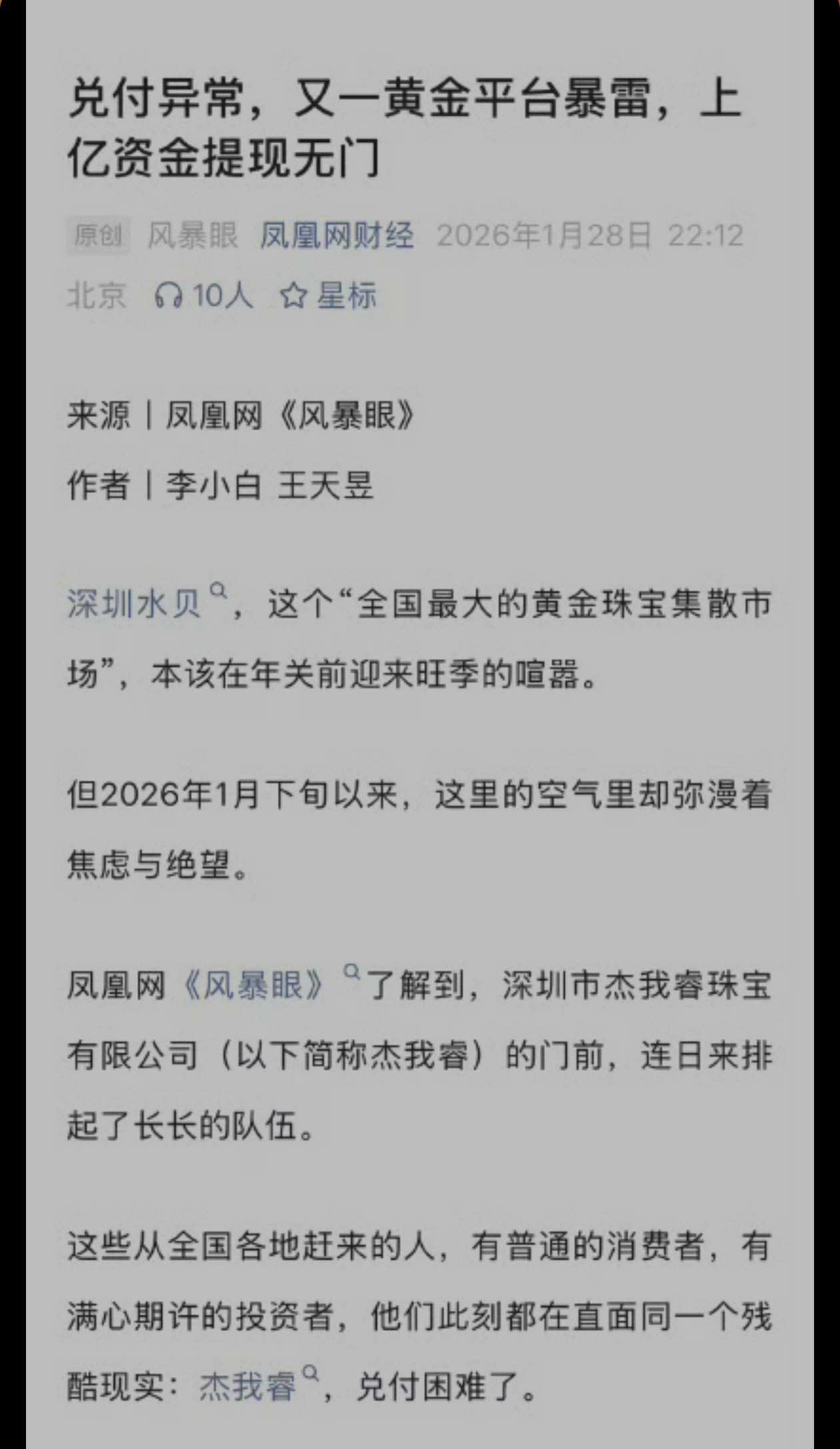 深圳水贝某黄金平台上亿元提现无门 说到黄金,肯定会说到深圳水贝,但现在说到的不是狂飙的黄金价格,而是这里的这家公司,说平台上上亿元提现无门。被炒上天的黄金,现在出大坑了。有人在等着提现的吗????深圳水贝某黄金平台上亿元提现无门