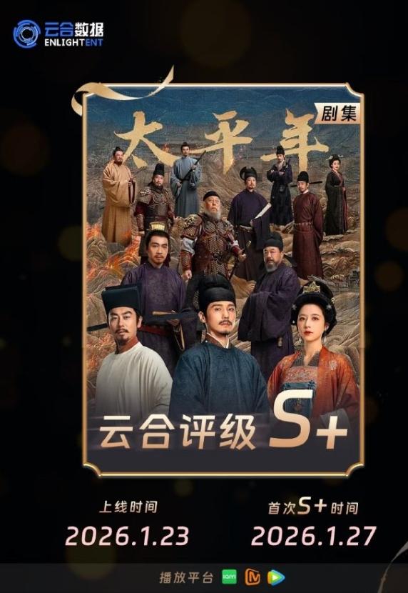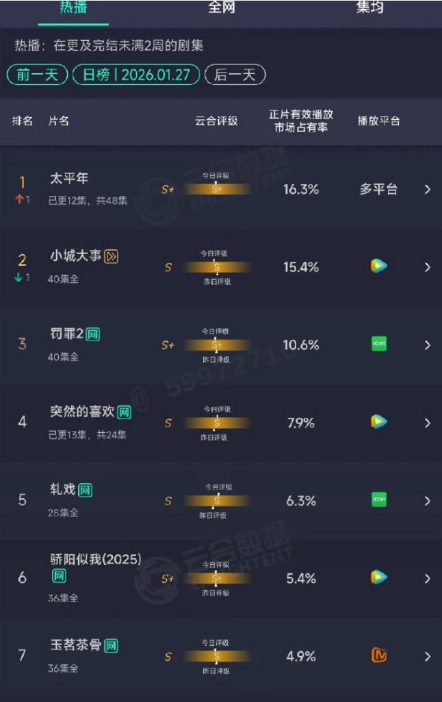 《太平年》云合登顶! 白宇的《太平年》云合占比16.3%,云合登顶,评级达到S+,赵丽颖《小城大事》播放量颓势明显,完播集均930多万,黄景瑜《罚罪2》,云合集均破3000万,2月14热播期结束,集均肯定比郭京飞的《老舅》高,2026年已经有2部剧集均破3000万了,都是25年12月份播的剧。