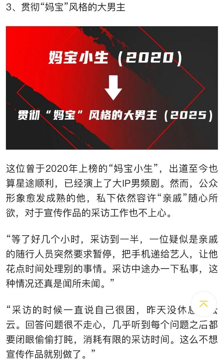 2025搜狐黑榜艺人! 三位黑榜艺人都是往年上过黑榜的艺人,第一位是,2023年被说“采访不能露腰不拍退的古偶男主”,2025年被说是"将缩头坚持到底的古偶男主”,第二位在2024年被说是“高片酬糊弄姐”,2025年是“傲慢不尊重人的罢工姐”,第三位2020年是“妈宝小生”,2025年是“贯彻妈宝风格的大男主”,网友猜测提名最多的三个艺人是85生罗老师,95花王老师和95生吴老师。