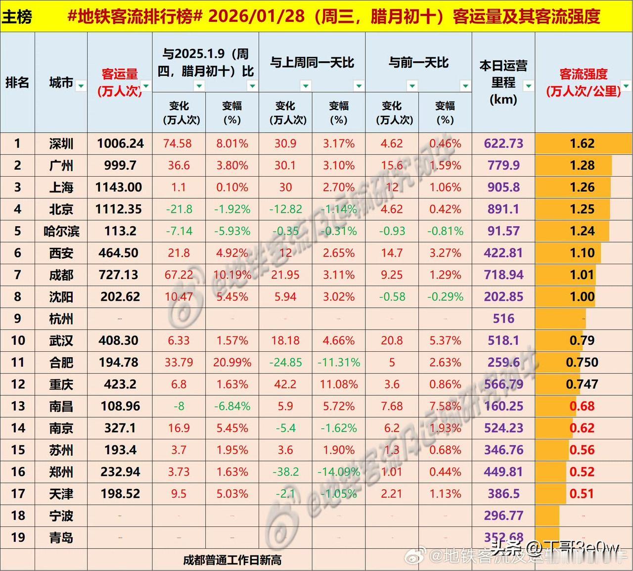广州地铁客流量周三达999万人次以上,差一点超千万 爆料 身边事 排行榜 周三 广州 2026年1月28日 星期③ 全国重点城市轨道交通客流量排行榜: 上海:1143.00万 北京:1112.35万 深圳:1006.24万深圳地铁 广州:999.70万广州地铁 成都:727.13万 西安:460.00万西安身边事 杭州:423万+杭州爆料 重庆:423.20万重庆身边事 武汉:408.30万 南京: 327.10万南京地铁 郑州:232.94万郑州地铁 沈阳:202.62万沈阳地铁 天津:198.52万天津身边事 合肥:194.78万 苏州:193.40万苏州爆料 青岛:113万+青岛地铁 宁波:113万+ 哈尔滨113.20万哈尔滨爆料 南昌:108.96万