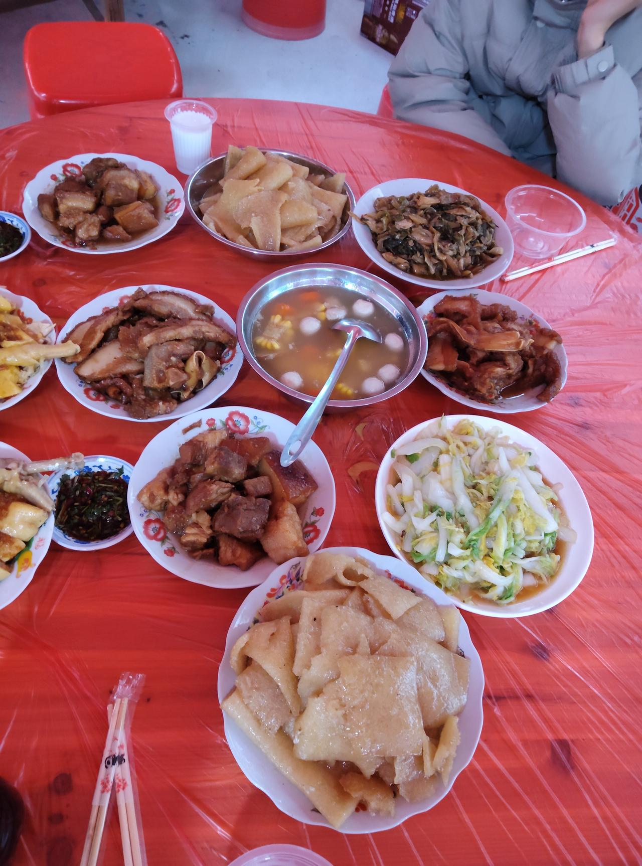 一进包间就闻着香了——这红塑料布圆桌,一看就是咱们这儿办席的标配! 肥而不腻的扣肉、炖得糯叽叽的猪蹄,还有那碗飘着玉米和丸子的甜汤,连炒白菜都浸着油香。最爱的还是那盘炸得焦脆的皮肚,裹满汤汁咬一口,香得能把舌头吞下去! 筷子往塑料套里一抽,旁边的小蘸碟里是辣乎乎的酱料,配啥都绝。这种席面不用讲排场,全是实打实的硬菜,吃的就是个热热闹闹的烟火气! 家用酒席红桌布 广西乡村酒席,必备菜品是什么?