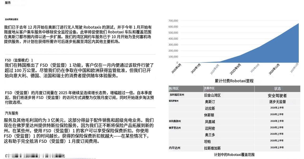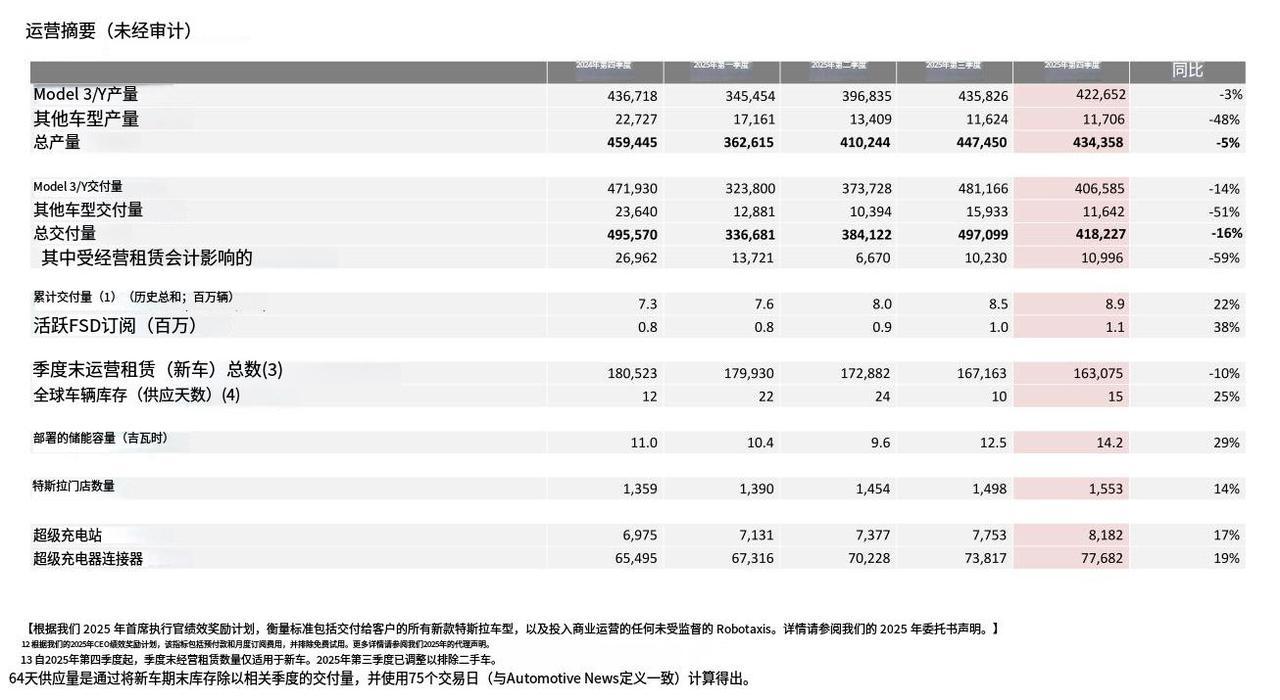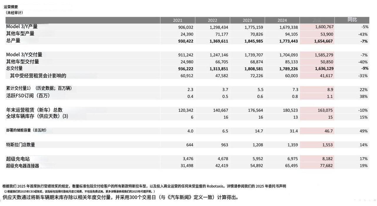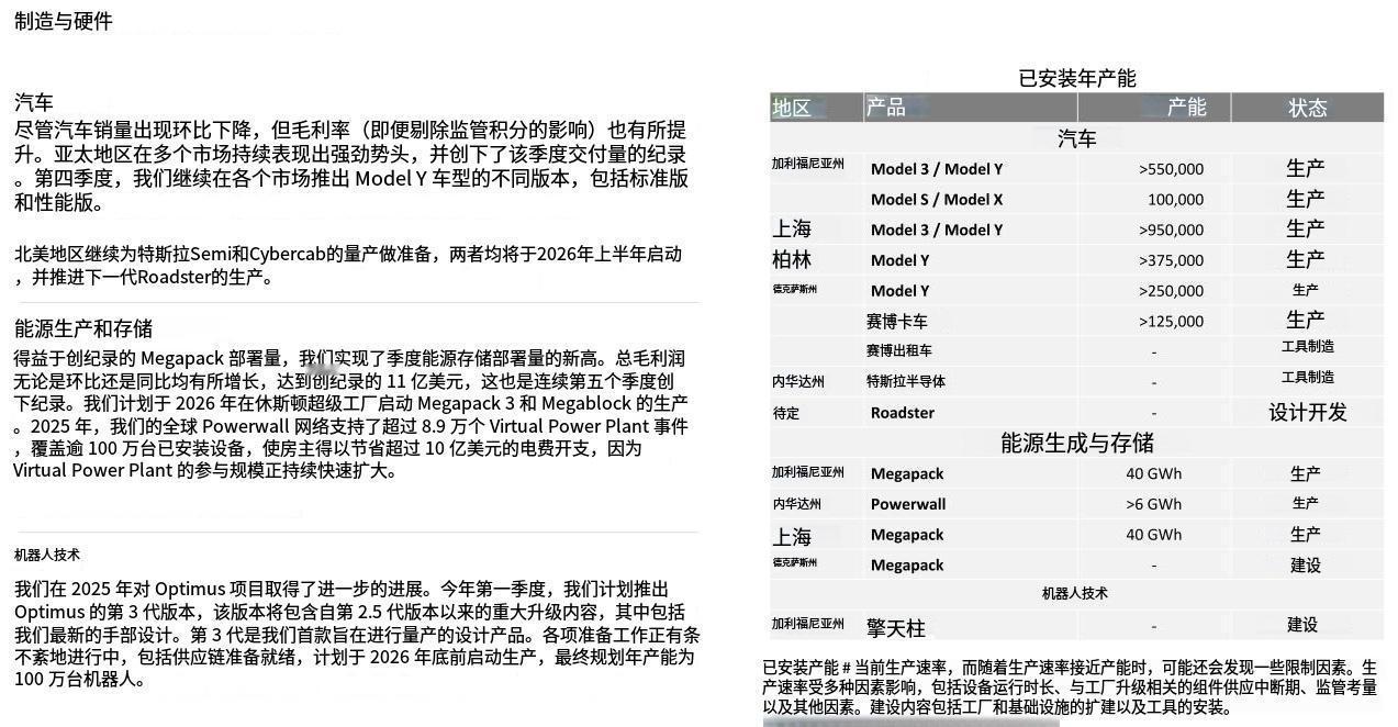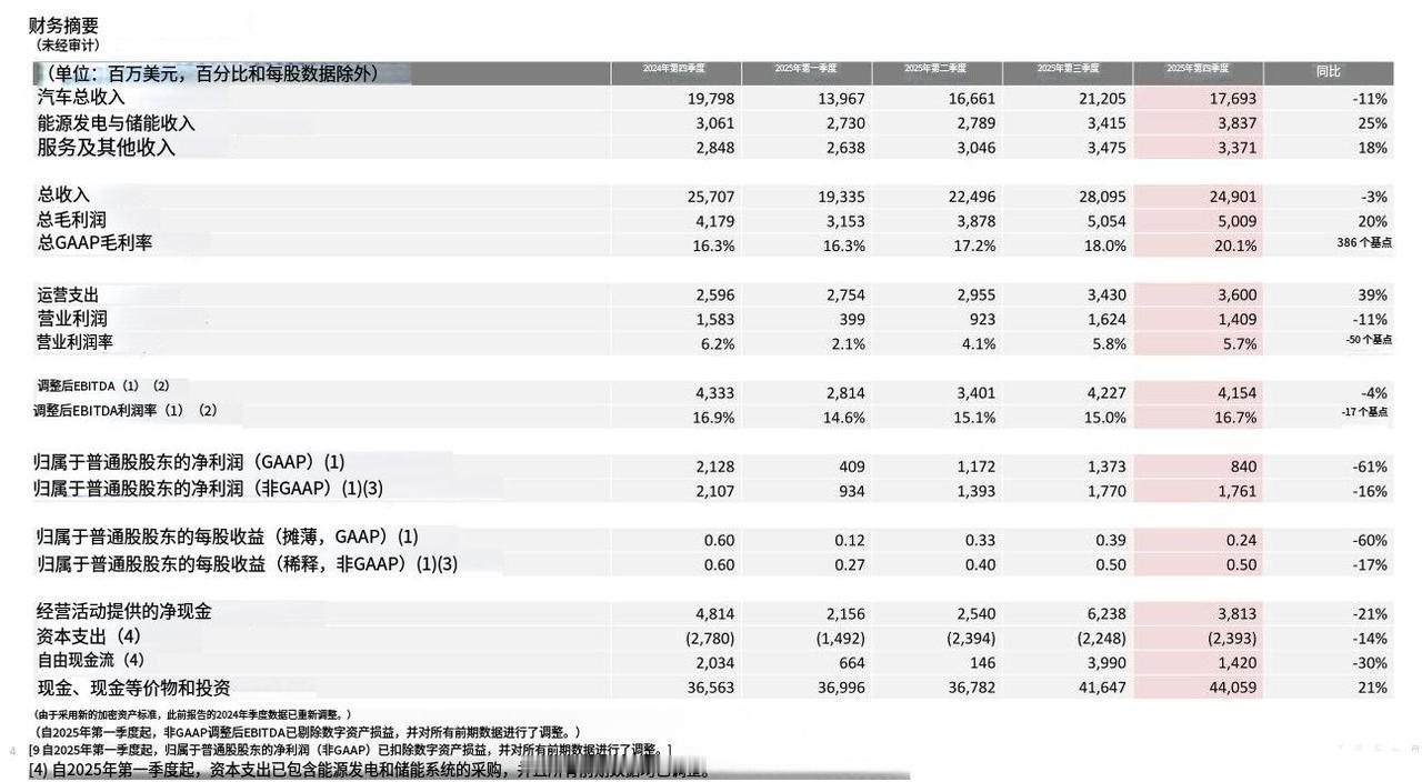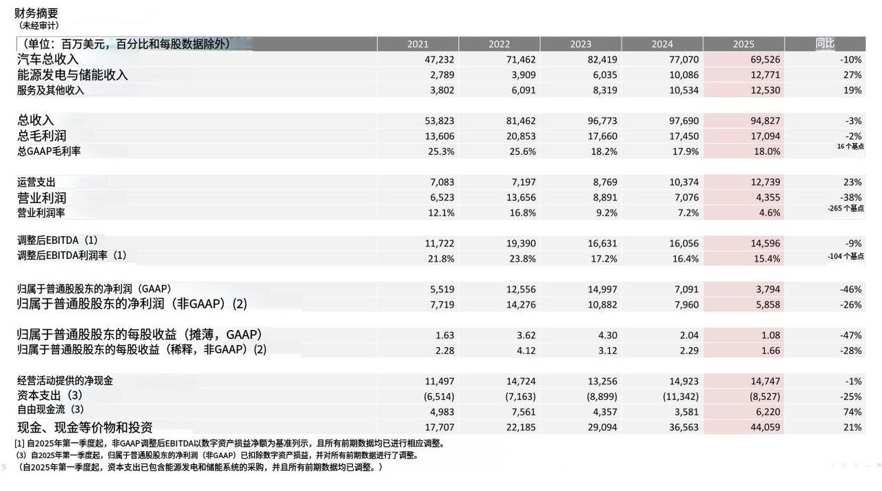 2025年汽车交付量下滑9%、毛利润下滑2%,特斯拉不行了? 特斯拉公布了2025年财报,其总收入下滑3%,总毛利润下滑2%。造成财务数据下滑的主因,是特斯拉汽车总收入下滑10%、运营支出提升23%。Model 3/Y是销量主力,占总销量的96.7%,销量下滑5%,其他车型如Model S/X、Cybertruck等的累计销量下滑43%。马斯克提出计划于下季度停产Model S/X,原弗里蒙特工厂生产线将改造为年产100万台Optimus机器人的基地。 特斯拉仍然是一家在赚钱的公司,2025年GAAP净收入为38亿美元、非GAAP净利润为59亿美元、经营现金流为147亿美元、自由现金流为62亿美元。2025年第四季度总GAAP毛利率提升至20.1%,使得2025年全年总GAAP毛利率达到18%,较2024年要好,体现优秀的经营效率。2025年特斯拉活跃FSD订阅用户约110万,增加38%,后续特斯拉取消FSD买断制,活跃FSD订阅用户增加有望更快。 今后卖车或许不会是特斯拉最主要的业务,它将从以硬件为中心的业务向实体人工智能公司转型,比如提供智能交通服务。基于无监督FSD(马斯克认为已经可以100%无监督),特斯拉的Robotaxi或CyberCab,将实现让数百万车主将车辆加入自动驾驶车队赚钱。 关于能源,马斯克再次提及,为地球电网扩容的最好方式是“地球上的太阳能+电池”以及“太空中的太阳能”。 2026年特斯拉的资本预计将超过200亿美元,以支撑锂精炼厂、LFP电池工厂、CyberCab工厂、Semi工厂、一个新的Mega储能工厂以及Optimus工厂等的运营。 综上,现在尚不能说特斯拉不行了,而是该看看它的未来,如智能交通、实体AI。【来自懂车帝车友圈】