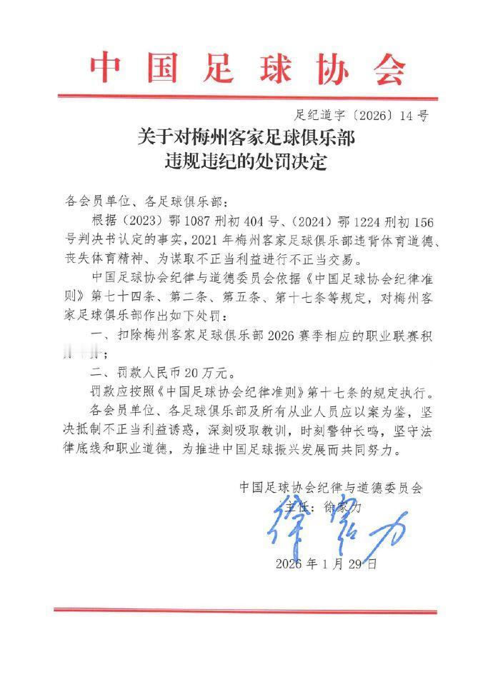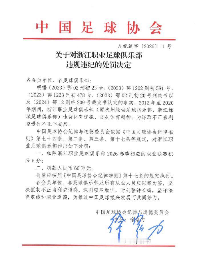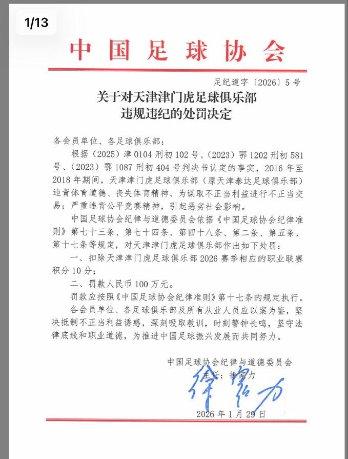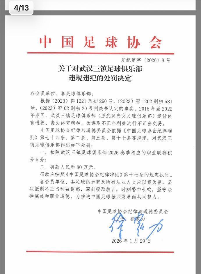 根据公安、司法部门向国家体育总局、中国足球协会移交的足球行业“假赌黑”问题案件材料,中国足球协会纪律与道德委员会对案件材料进行全面系统梳理,按照《中国足球协会纪律准则》等相关规定,完成对涉案俱乐部及涉案人员的行业处罚审议工作。 9支俱乐部的球队将在今年中超将以负分起步,也意味着中超“升班马”辽宁铁人、重庆铜梁龙以及其他未被罚分的云南玉昆、青岛西海岸、大连英博、深圳新鹏城这些近几个赛季跻身中超的新军形势大好,成都蓉城则有望继续冲击冠军[灵光一闪]