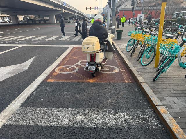 雍和宫桥下路口,电动自行车“越线停车”是最常见的违法行为。该路口非机动车停止线后方不仅施划了第二道提示线,还标注着“停车不越线”的文字提醒,但早高峰期间,仍有多位驾驶人将车辆停在禁停的黄色网格线内,甚至越过非机动车停止线。