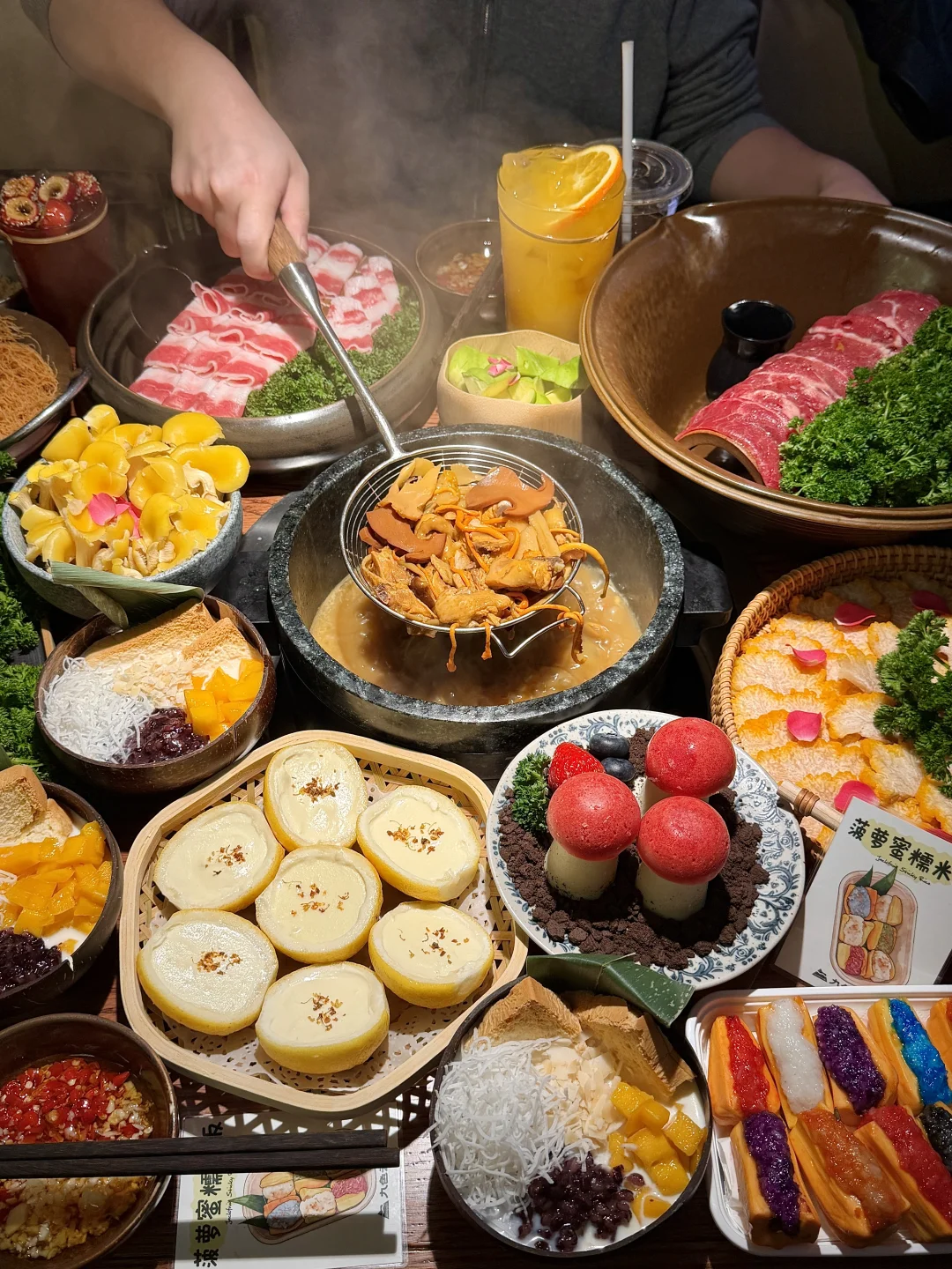 该怎么形容这一口柠檬夹酸奶……!有多好吃啊!还有炸年糕、奶白米酒、伪装的蘑菇、泡鲁达……都好好看好好吃啊😭😭 真的会被重庆这家云南菌汤火锅(📍九色云)给惊艳住了!本以为只是普通的火锅店,没想到甜品做的这么貌美好吃!随手拍都好好看啊🥹尊嘟好适合约会~主打的火锅也好正宗,鲜切牛肉一定要试试!吃得出的品质好,搭配菌汤底感觉不用蘸料都嘎嘎香了