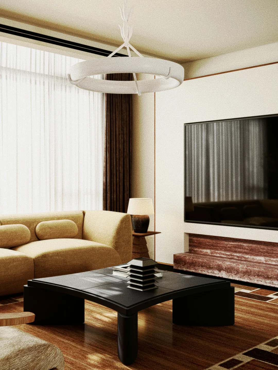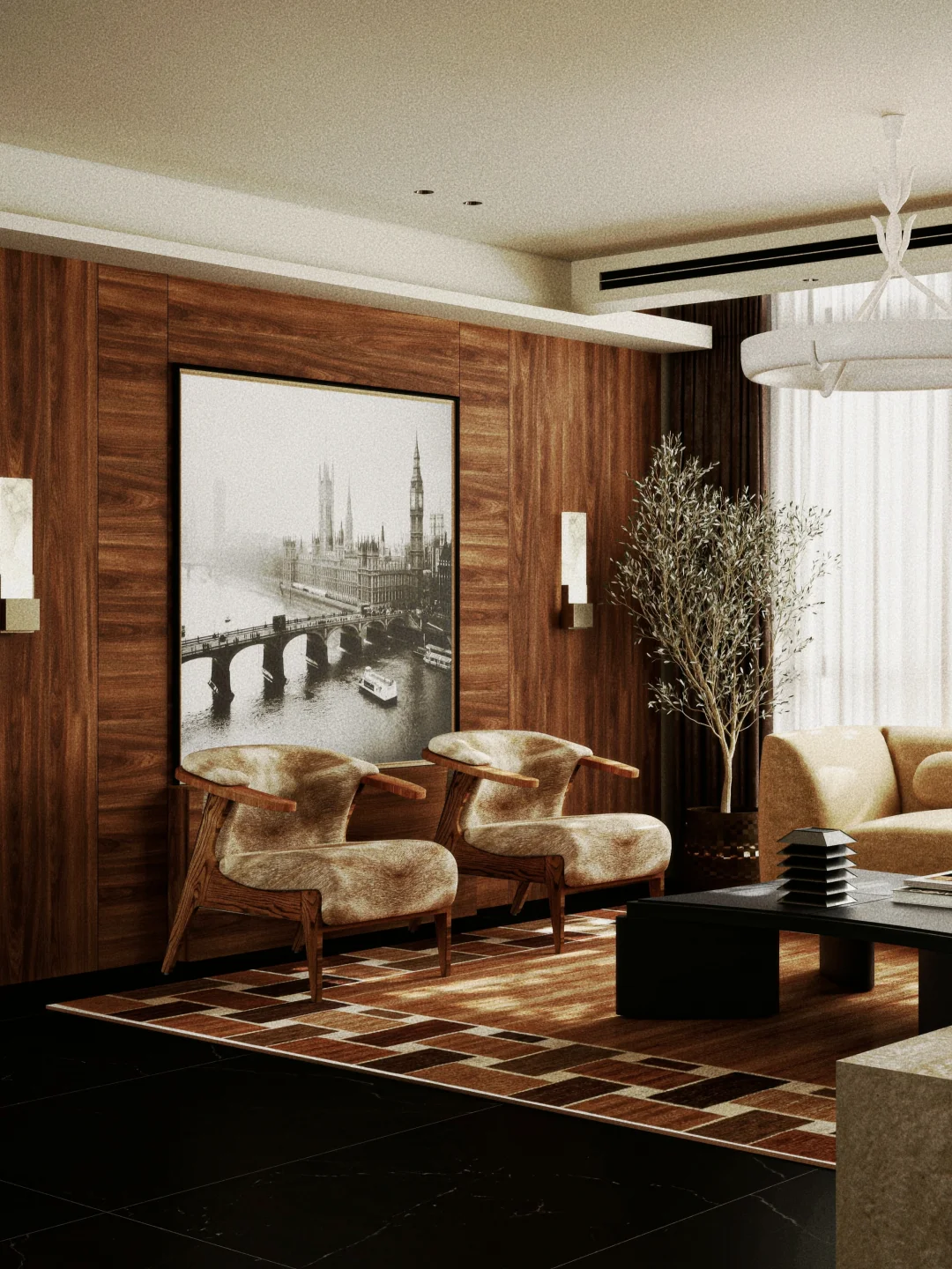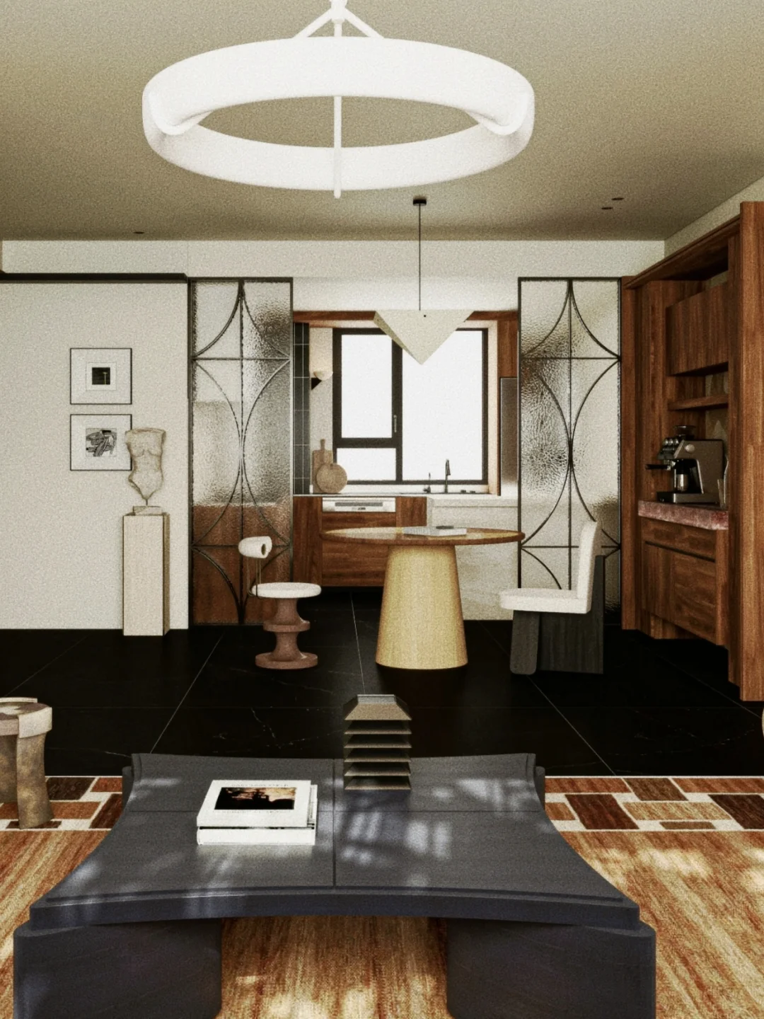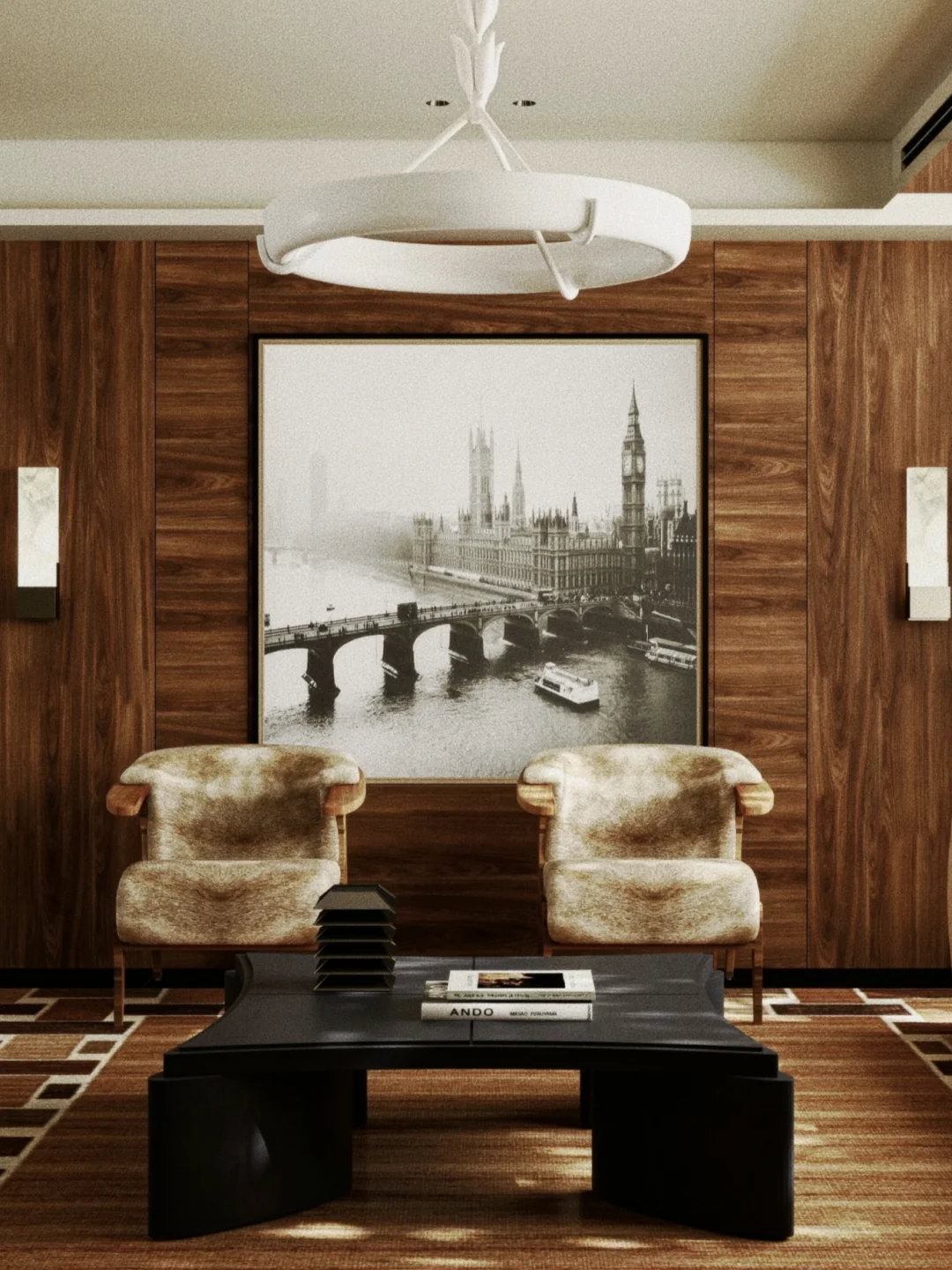 【地毯搭配】:地毯是界定区域的灵魂!选择一块比沙发尺寸更大的地毯,可以把整个会客区“框”起来,视觉上更完整、更显大。