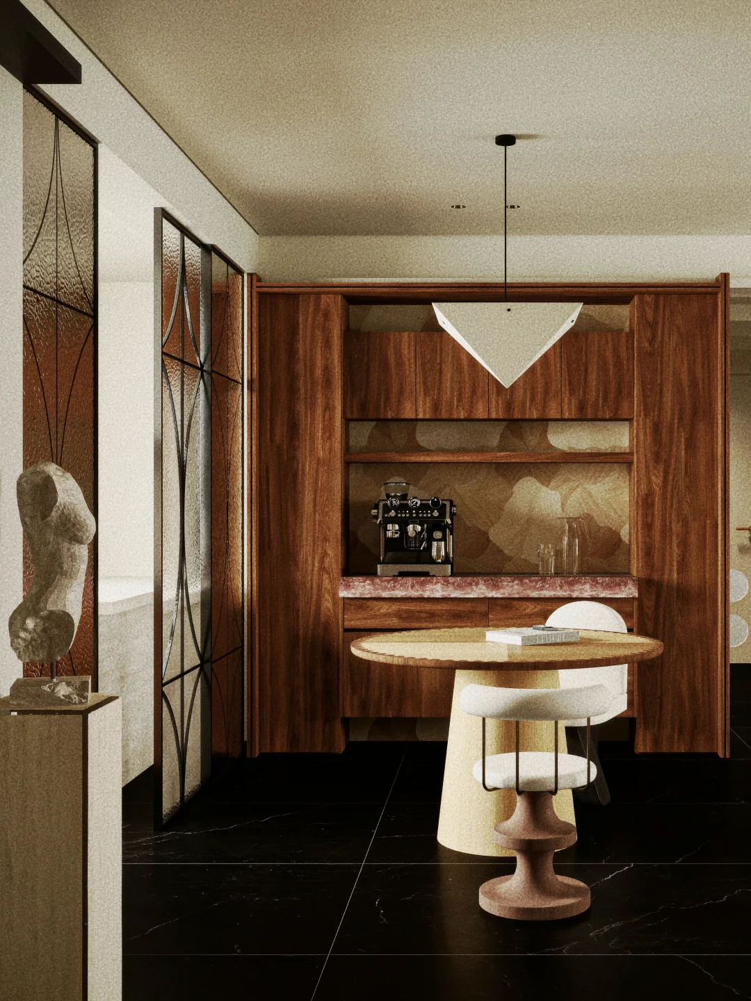 【沙发选择】:不靠墙的沙发,最好选择前后都好看的“高背款”,或者在背后加一个长条凳、置物架,让视觉上不显得空。