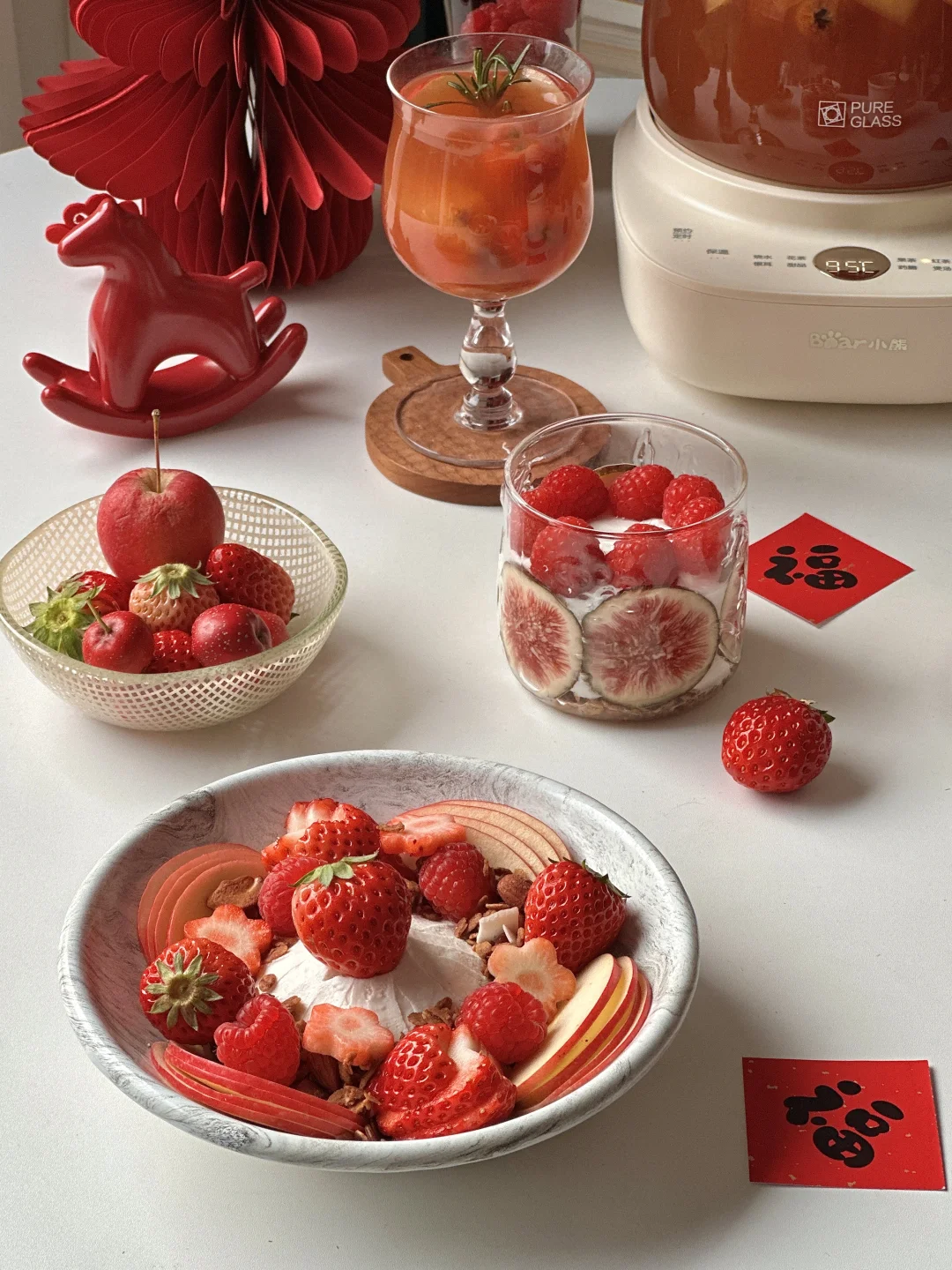 摆上切片苹果与切片草莓🍓🫐