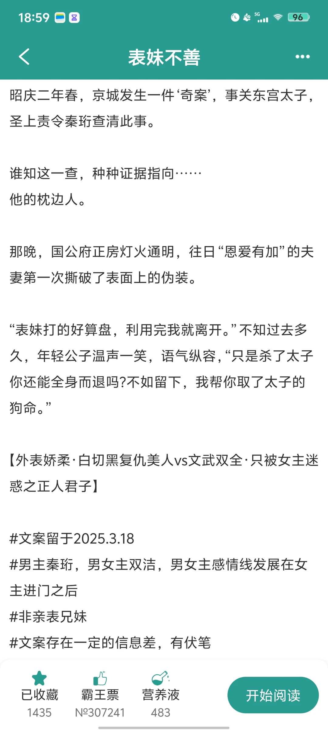《表妹不善》by乔燕 白切黑表vs高岭花 日久生情,女主重生 故事很精彩,伏笔多多 [桃子R]女主原本是大家闺秀,国公府的郡主,未来的太子妃,不料父兄被人陷害谋反,她也被太子逼得喝了毒药,没想到再次睁眼,她已经是另一位姓顾的姑娘。现在的身份是小家碧玉,男主家府上的表姑娘。 [桃子R]女主知道男主是太子的伴读,所以想借助男主的手查清真相,为自己报仇。相处中,男主对女主动了几分真心。女主还主动找了自己的旧识故交,暗中为自己办事。 [草莓R]女主原本的未婚夫落水早亡,老夫人才安排她嫁给未婚夫的堂兄,也就是男主,男主调查得知堂弟还活着。原本的顾小姐对未婚夫死心塌地,现在的女主却失去记忆忘了他。男主对女主的身份起了疑心。