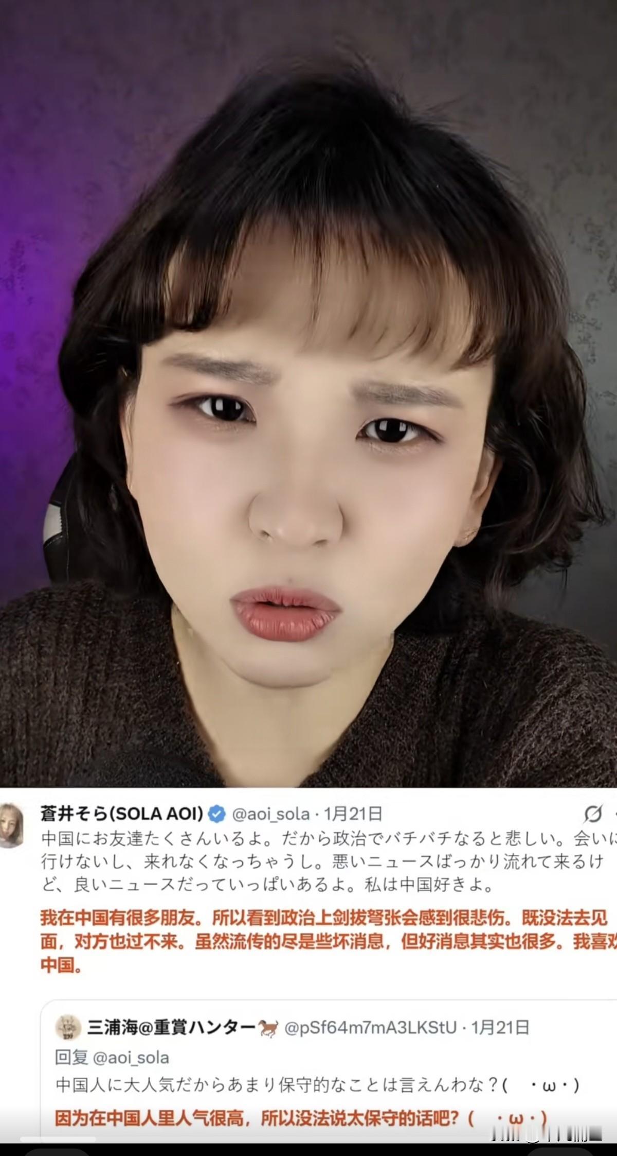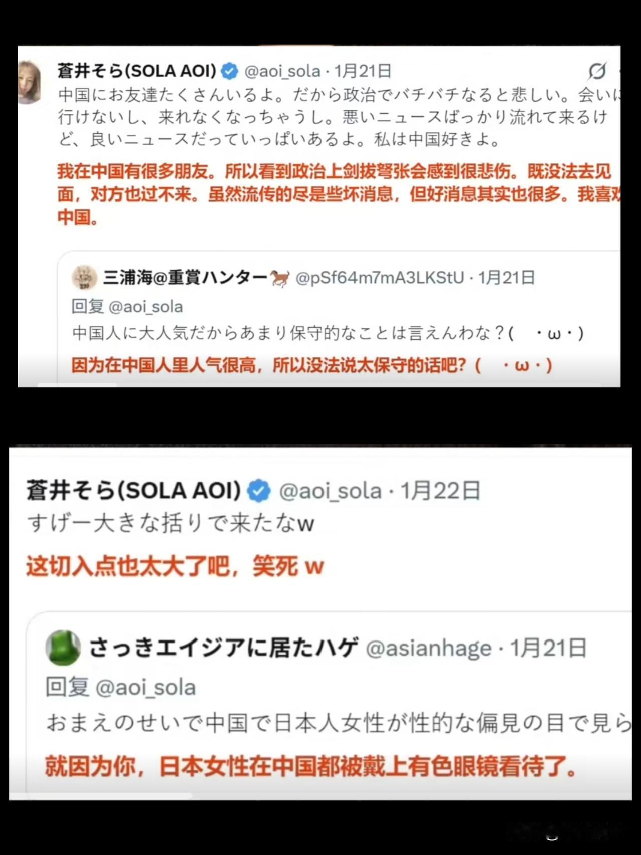 原来苍井空才是中国人民真正的朋友!日本演员苍井空在社交媒体X平台上和日本右翼网友开撕,竟然是为了中国。她说,她在中国有许多朋友,为现在政治上的剑拔弩张感到悲伤……她还大方的说道,她喜欢中国。她的言论迅速引起了许多日本右翼的不满,甚至对她进行言语侮辱。有人称她是中国的走狗,她也大方回应 ,做中国的走狗,挺可爱的,还不忘自嘲的“汪、汪”。 关于苍井空,那是中国人都熟悉的名字,尤其在男同胞眼中有着特殊的地位。现在突然感觉,中国的男人没有白喜欢这个日本女人,关键时刻她是中国人真正的朋友。能够在如此尖酸的日本国内环境下,依然坚定的保持对华友好,这样的人士才是真正的中日友好人士,是我们真正的朋友。她超越了政治的范畴,是中国和日本人民之间纯粹的友谊,这更值得长久的珍惜。 当然也要感谢那位女博主,向国人转达这样的消息,让我们看到了一个从骨子里对华友好的日本人,还是有一定影响力的知名艺人。她就是一个对华友好人士,我们应该珍惜这样的朋友。