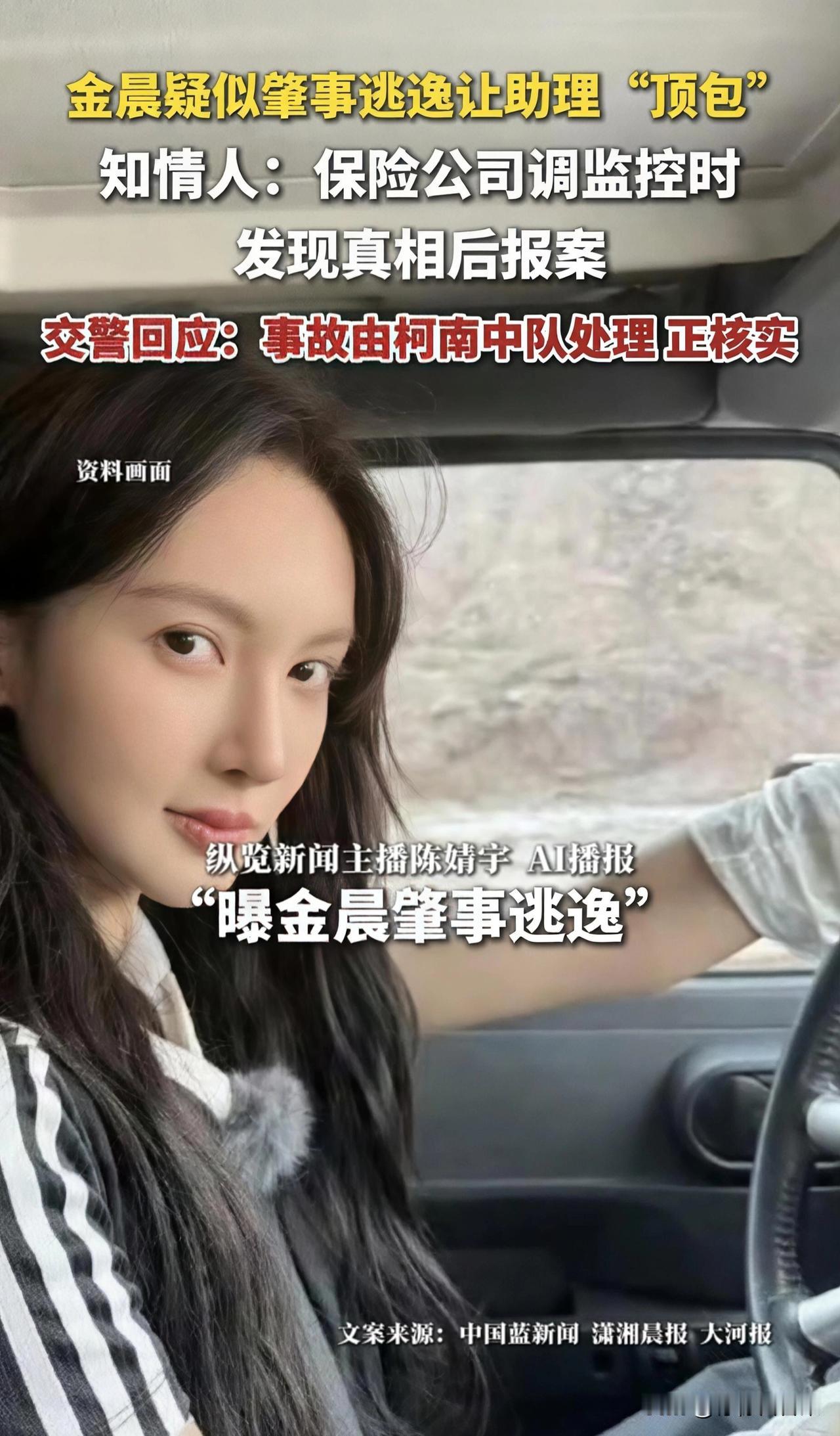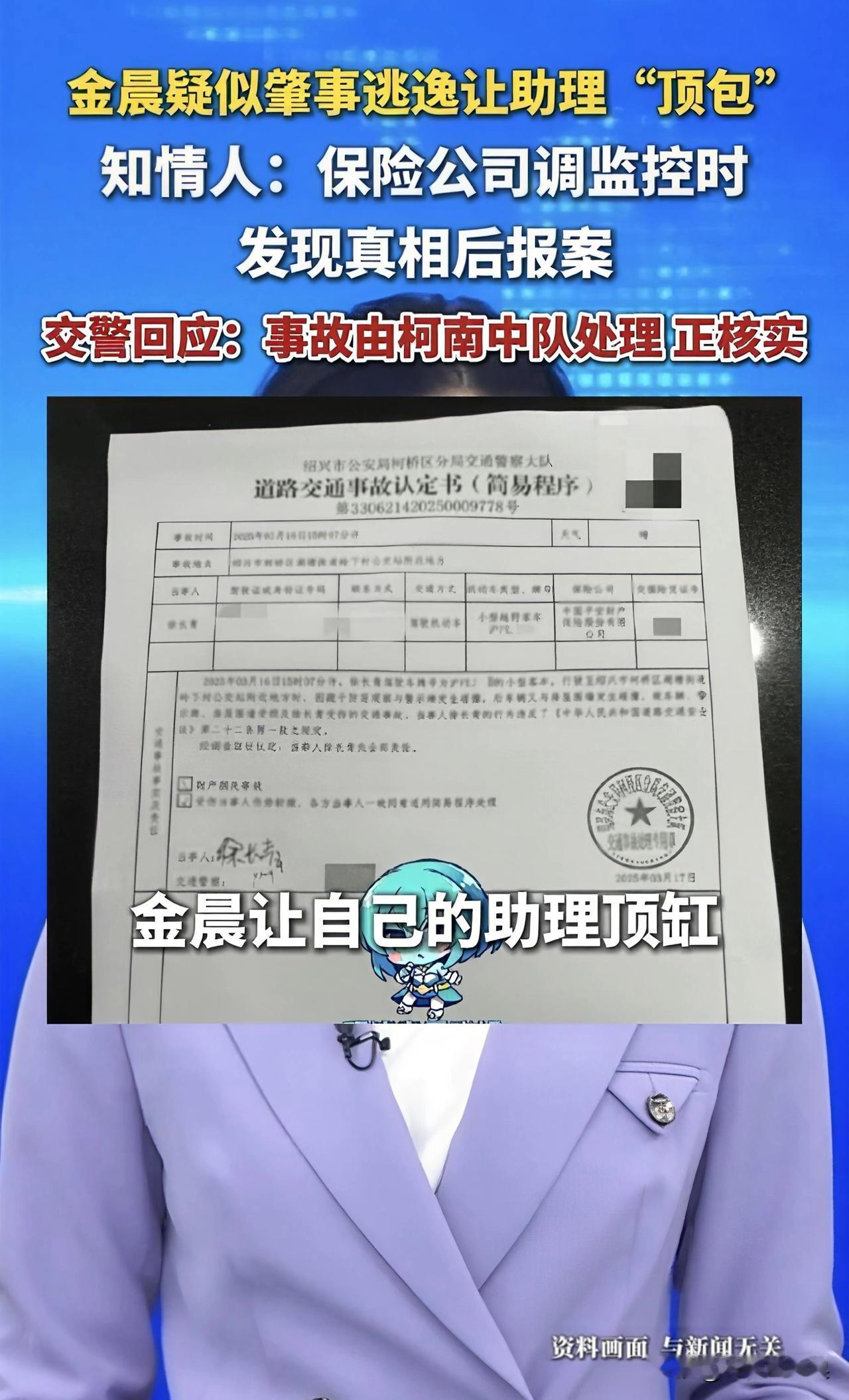 金晨翻车?肇事逃逸+助理顶包,刚刷到这个瓜真的惊到我了。 据纵览新闻报道,演员金晨被曝在绍兴发生交通事故后,直接让助理“顶包”处理,自己和经纪人溜之大吉。 要不是保险公司理赔时调监控发现真相报了警,这事可能就这么瞒过去了。 更离谱的是,金晨方面后来还想私了,让保险公司撤案。 现在绍兴柯南交警中队已经介入调查,就等官方通报了。 这事儿可大可小,法律界人士都说,哪怕没拿到理赔金,也涉嫌保险诈骗未遂。 一旦坐实,不仅要面临行政处罚,搞不好还要负刑事责任。 其实金晨这两年势头正猛,《孤注一掷》《骗骗喜欢你》票房都不错,眼看就要冲准一线了。 结果出了这么一档子事,真的太败路人缘了。 在此也给所有人提个醒: 不管你是明星还是普通人,开车出了事别耍小聪明。监控、保险、交警,哪一环都不是吃素的,侥幸心理只会把小事闹大,最后得不偿失。 你怎么看这件事?