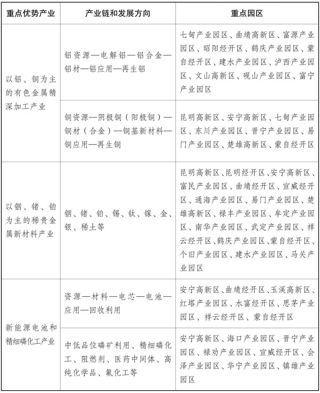 1.以铝、铜为主的有色金属精深加工产业。实施有色金属产业延链补链强链专项行动,大力发展再生铝、铝基和铜基新材料及终端产品,大幅提高铝、铜加工转化率,促进再生铝、铜与下游加工产业融合发展,打造国家战略性有色金属产业基地。