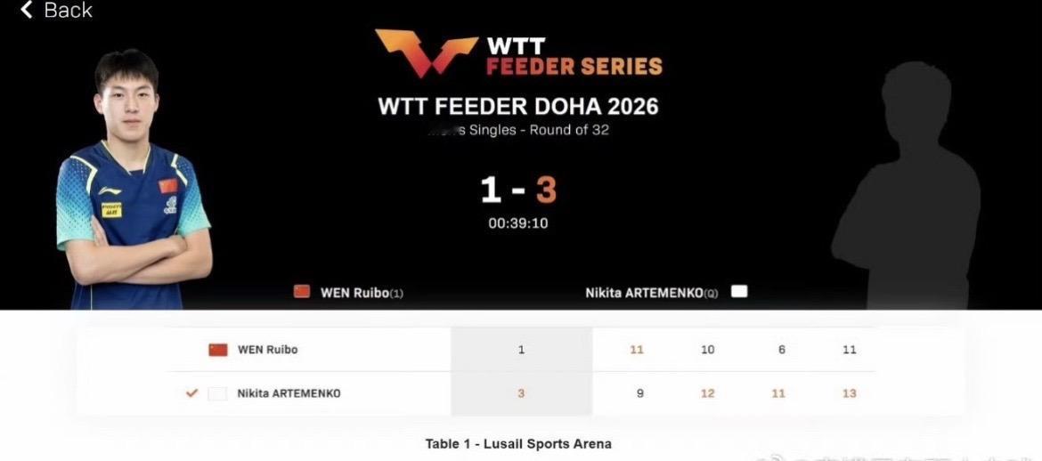 WTT支线赛多哈站丨男单1/16决赛 温瑞博🇨🇳1-3尼基塔·阿尔乔缅科(AIN)【11-9,10-12,6-11,11-13】