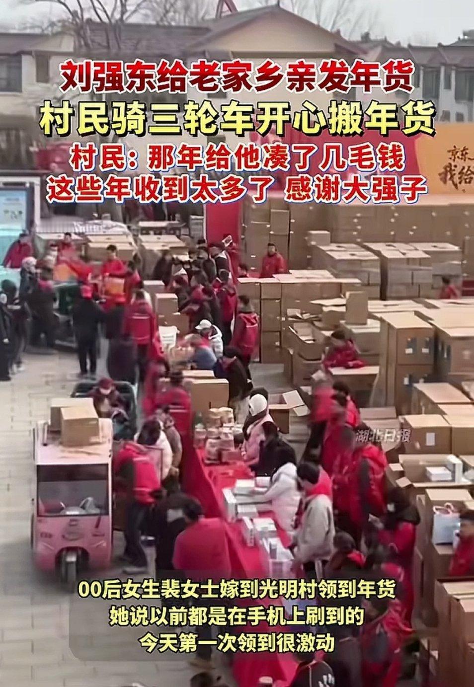 刘强东连续多年给老家送年货“大强子”刘强东又回宿迁老家给乡亲们发年货了,今年不仅