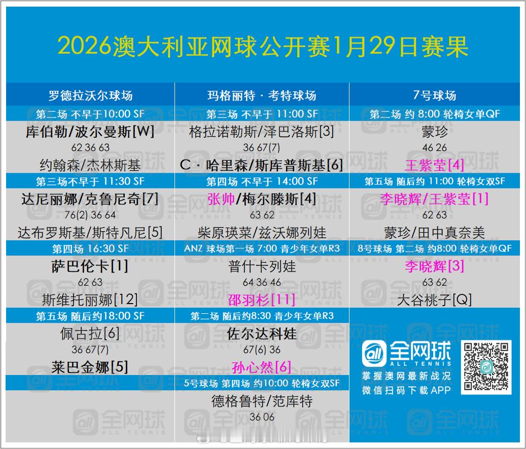 澳网2026 1月29日赛果与女单签表更新❣️女单决赛对阵:萨巴伦卡vs莱巴金娜女双决赛对阵:张帅/梅尔滕斯vs达尼丽娜/克鲁尼奇这很澳网体育大赏