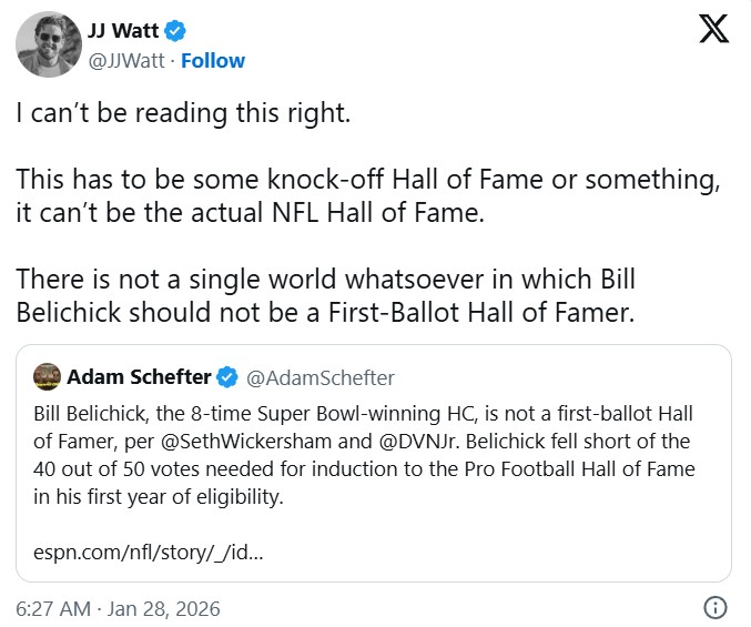 三届NFL年度最佳防守球员贾斯汀-詹姆斯-瓦特表态:“我肯定看错了。这肯定是某个山寨名人堂,不可能是真的。在任何一个世界里,比尔-贝利切克都该成为首轮名人堂成员。”