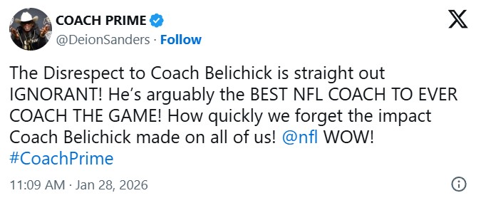 科罗拉多大学橄榄球队主教练、纪录片《主教练》主人公迪昂-桑德斯则表示:“对贝利切克教练的不尊重简直就是愚昧无知!他完全可以说是NFL历史上最伟大的教练!我们怎么这么快就忘记了贝利切克教练对我们所有人的影响!”