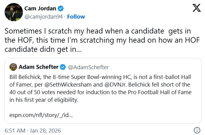 现役新奥尔良圣徒队防守端锋卡梅伦-乔丹也表态道:“有时候我会对某位候选人入选名人堂感到困惑,但这次我困惑的是,一位板上钉钉的名人堂候选人怎么没能入选……”