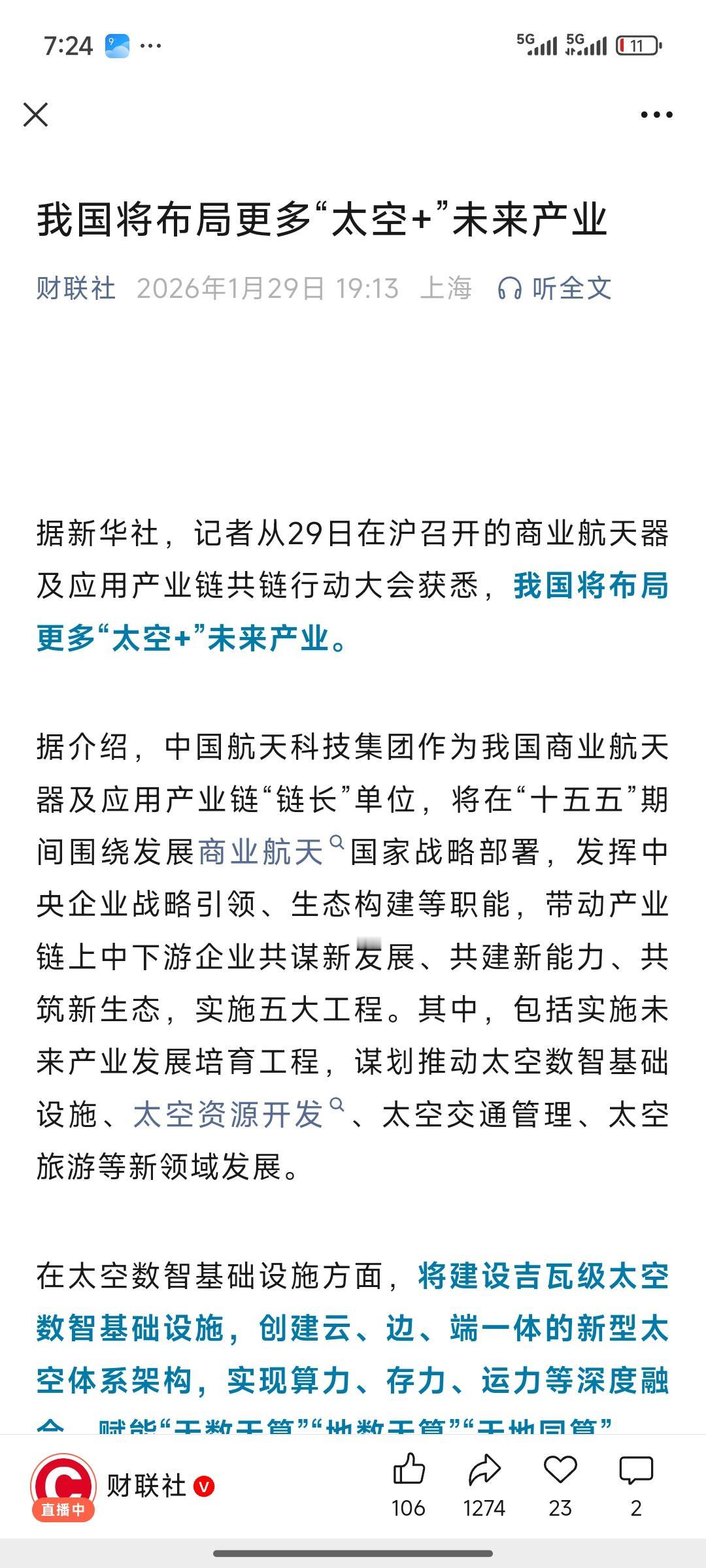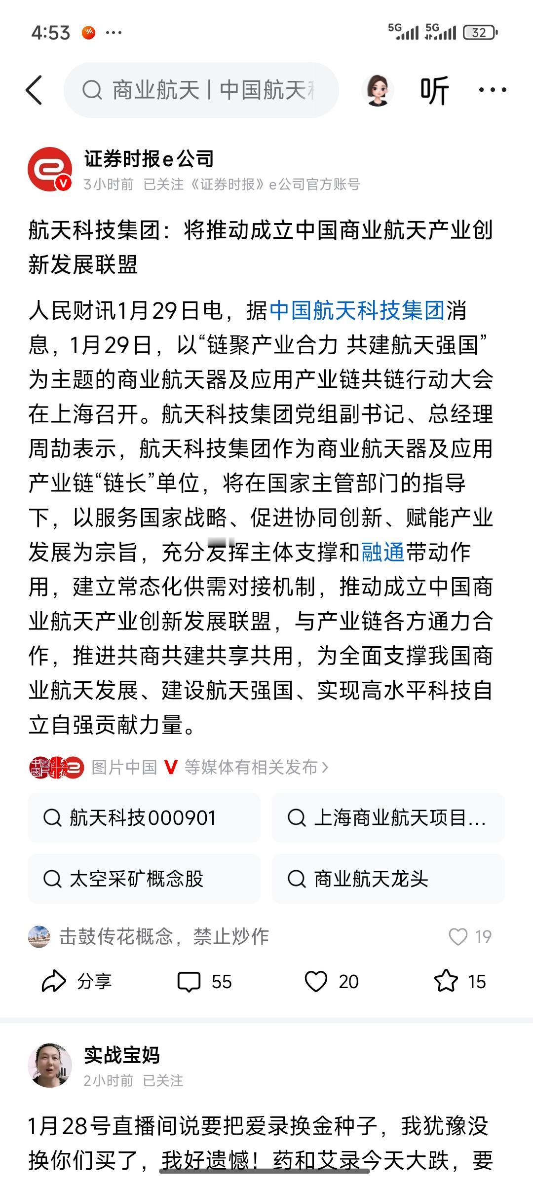 商业航天、航空航天领域近期持续调整,似有偃旗息鼓之势。不过这两天,有关商业航天、航空航天的利好消息纷至沓来,不仅国外消息不断,国内相关利好也是接连涌现。 然而,面对这些利好,商业航天相关股票却反应平淡。当利好积累到一定程度,是否会突然爆发呢?我持有商业航天航空股中的天通股份,便有这种“拍脑袋、屁股决定脑袋”的想法。这也是我一直持有天通股份,未去追逐其他热点的缘由。 股友们,你们还在坚持吗?你们还在坚持商业航空航天吗?航空航天板块 航天概念股 中国商业航天 航天发展市值 商业航天低价股 商业与航天 航天经济