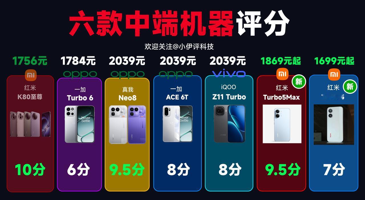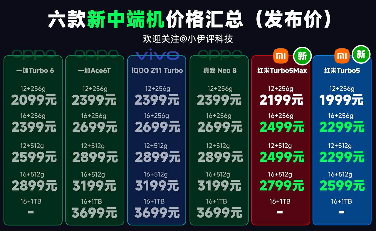六款2000元档中端机汇总,总体来说,红米Turbo 5Max的优势还是非常巨大的,主要体现在价格方面,尤其是12+512G的版本,价格优势来到了400元,非常夸张,别忘了这可是2000元档的市场,这个差价已经非常大了。 这个价位目前比较值得买的就是红米Turbo 5Max以及真我Neo 8,其他机器则不太推荐大家入手。