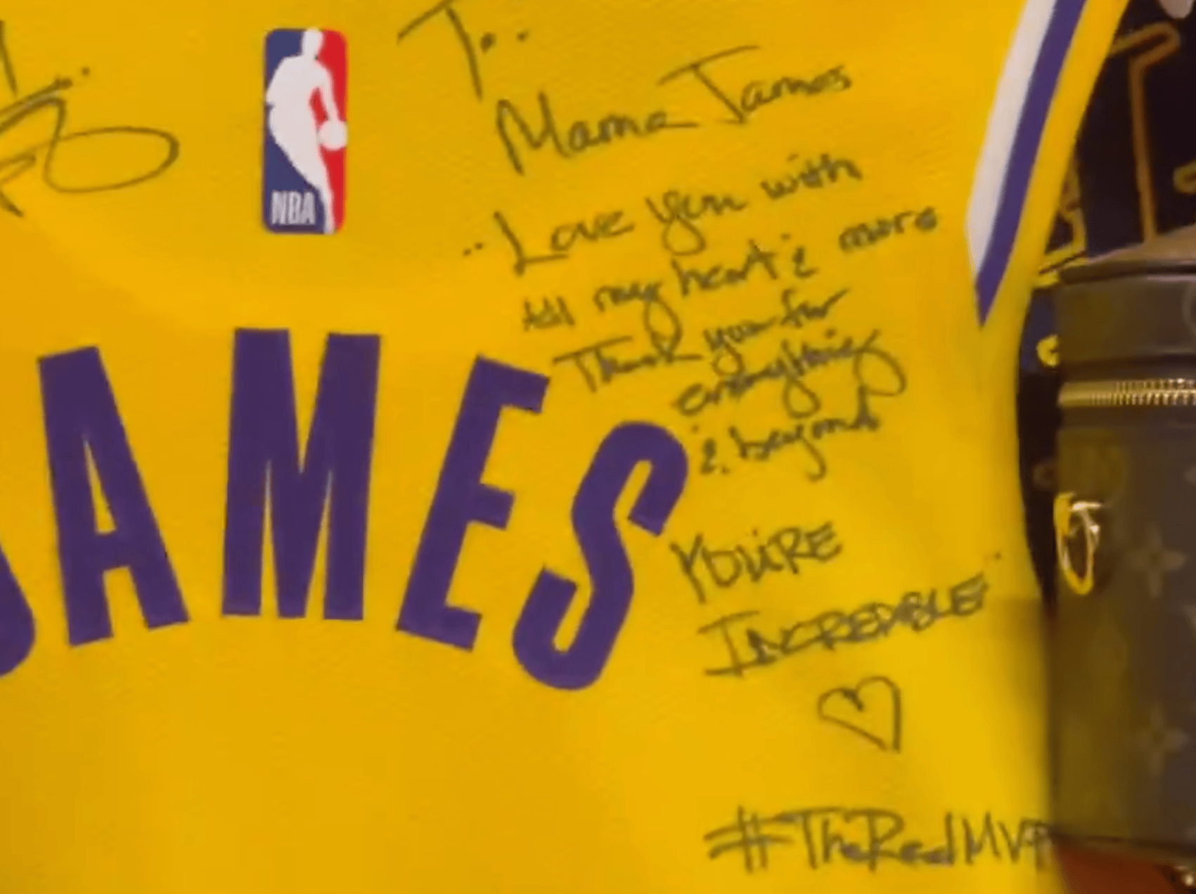 赛后,詹姆斯给全家亲朋好友签名合影留念,将自己的球衣送给了母亲并表示:妈妈,我全心全意地爱你,甚至更多。感谢你为我做的一切,你太棒了。