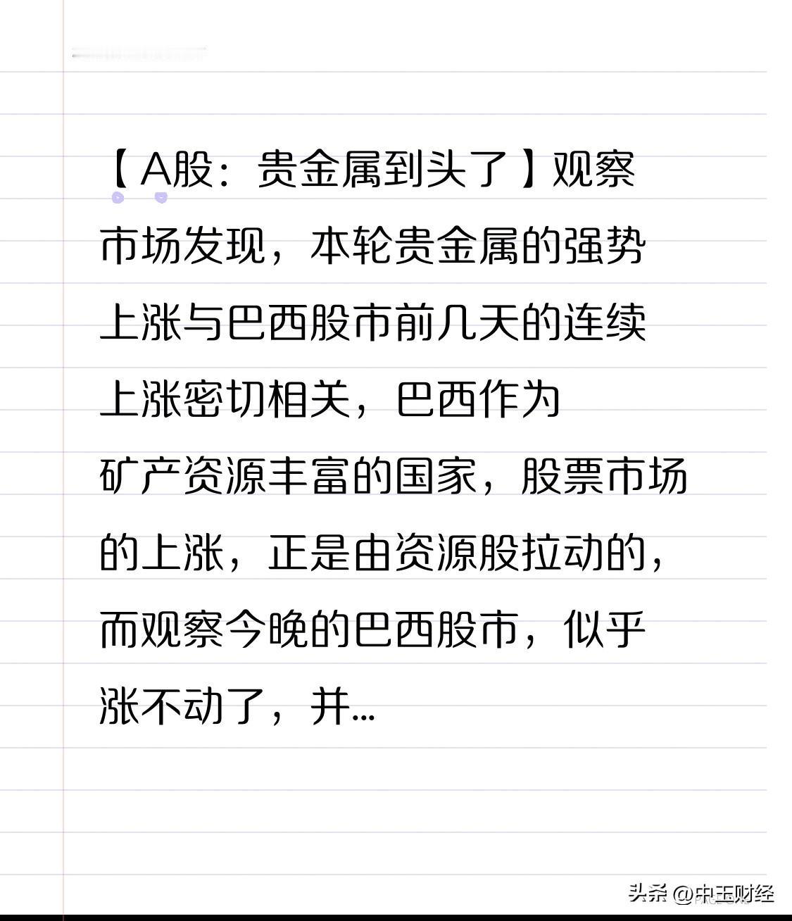 【A股:贵金属到头了】观察市场发现,本轮贵金属的强势上涨与巴西股市前几天的连续上涨密切相关,巴西作为矿产资源丰富的国家,股票市场的上涨,正是由资源股拉动的,而观察今晚的巴西股市,似乎涨不动了,并且有可能转成下跌走势,因此,一旦巴西股市这个能源代表着市场出现大幅度下跌,贵金属也将面临跟随效应!贵金属 贵金属行情走势 贵金属行情分析