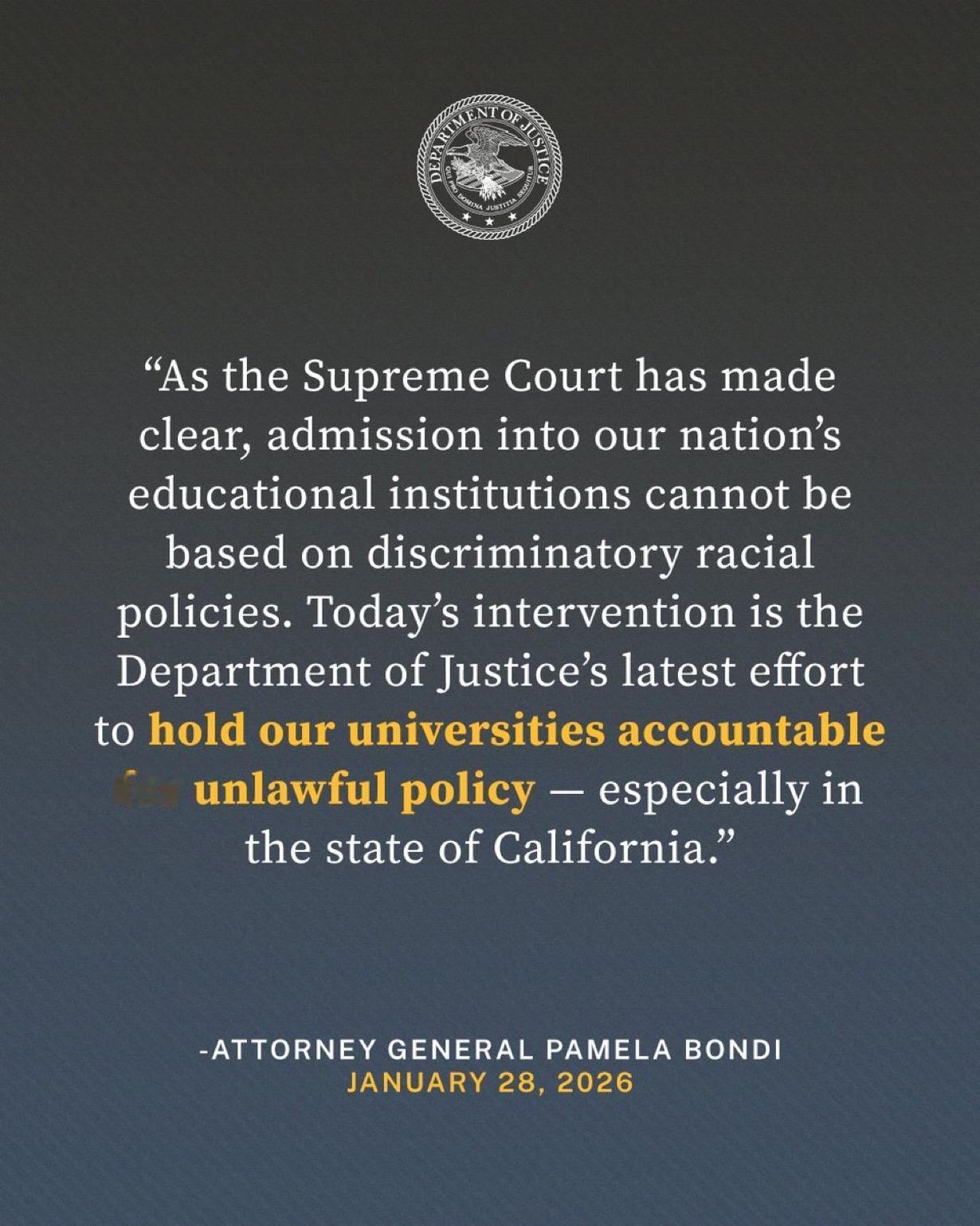 美国司法部加入针对加州大学洛杉矶分校医学院招生种族歧视的诉讼。 “正如最高法院所明确指出的,我国教育机构的招生不能基于歧视性的种族政策,” 司法部长邦迪AGPamBondi说道。“今天的干预是司法部为追究大学非法政策责任而采取的最新举措——尤其是在加利福尼亚州。”