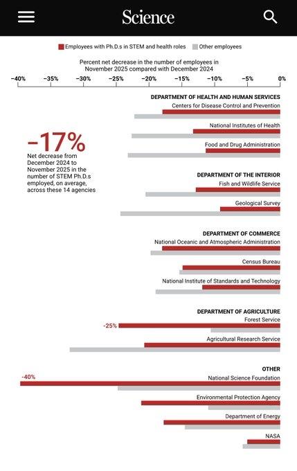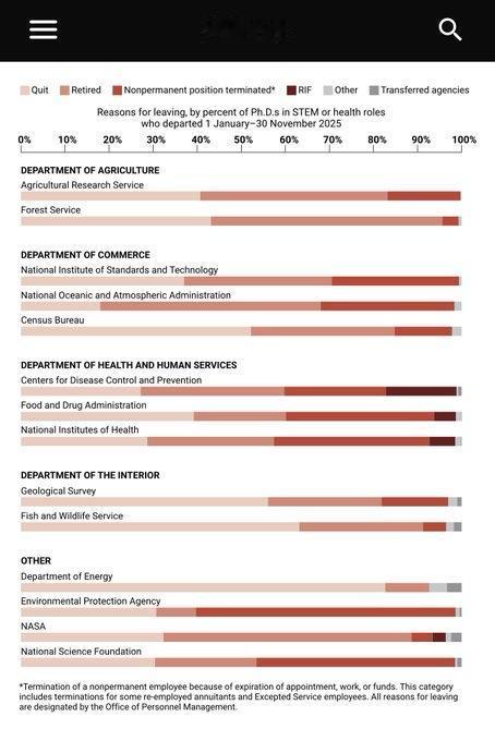 自从2025年特朗普上台,去年有1万名理工科(STEM)博士因为被开除、或退休、或辞职而离开了美国联邦政府部门。