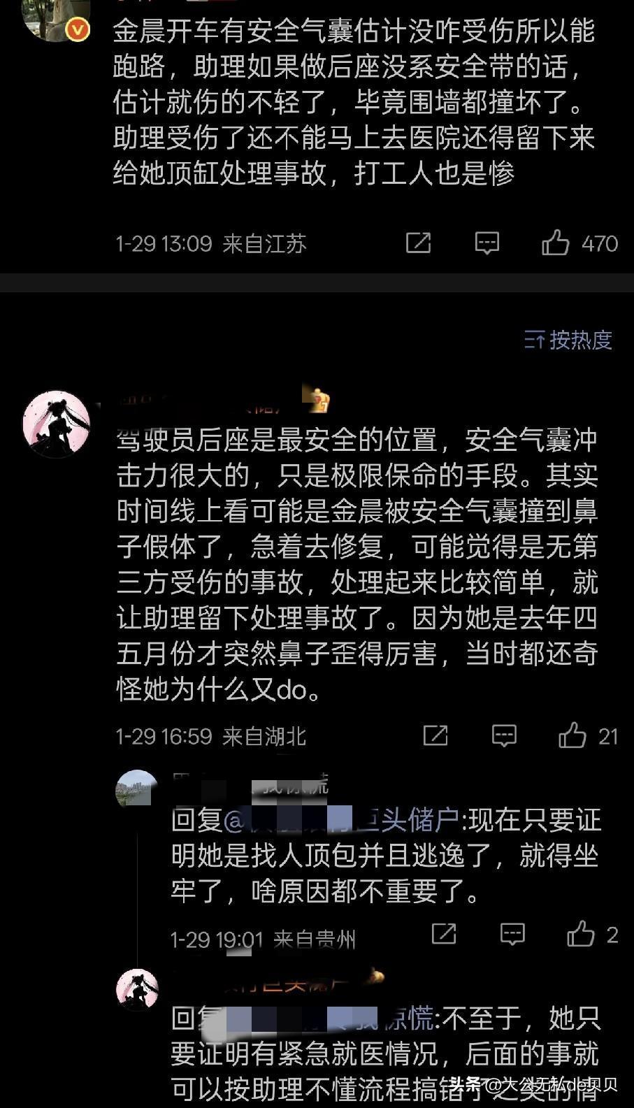 金晨肇事逃逸的原因,已经越传越离谱了! 大部分都猜她应该是酒驾了,不然没理由在撞车后逃跑啊。 又没有伤亡,就是撞了个护栏。跟当年李y峰情况差不多。 🌿当年是因为🈶工作着急飞国外,而且人家也没找人顶包,而是留下工作人员善后。 金晨就比较奇怪了,一天了也没有发声明回应自己当时为何逃逸? 还专门安排助理留下来顶包,想把自己摘出去。 那只能说明心里有鬼。