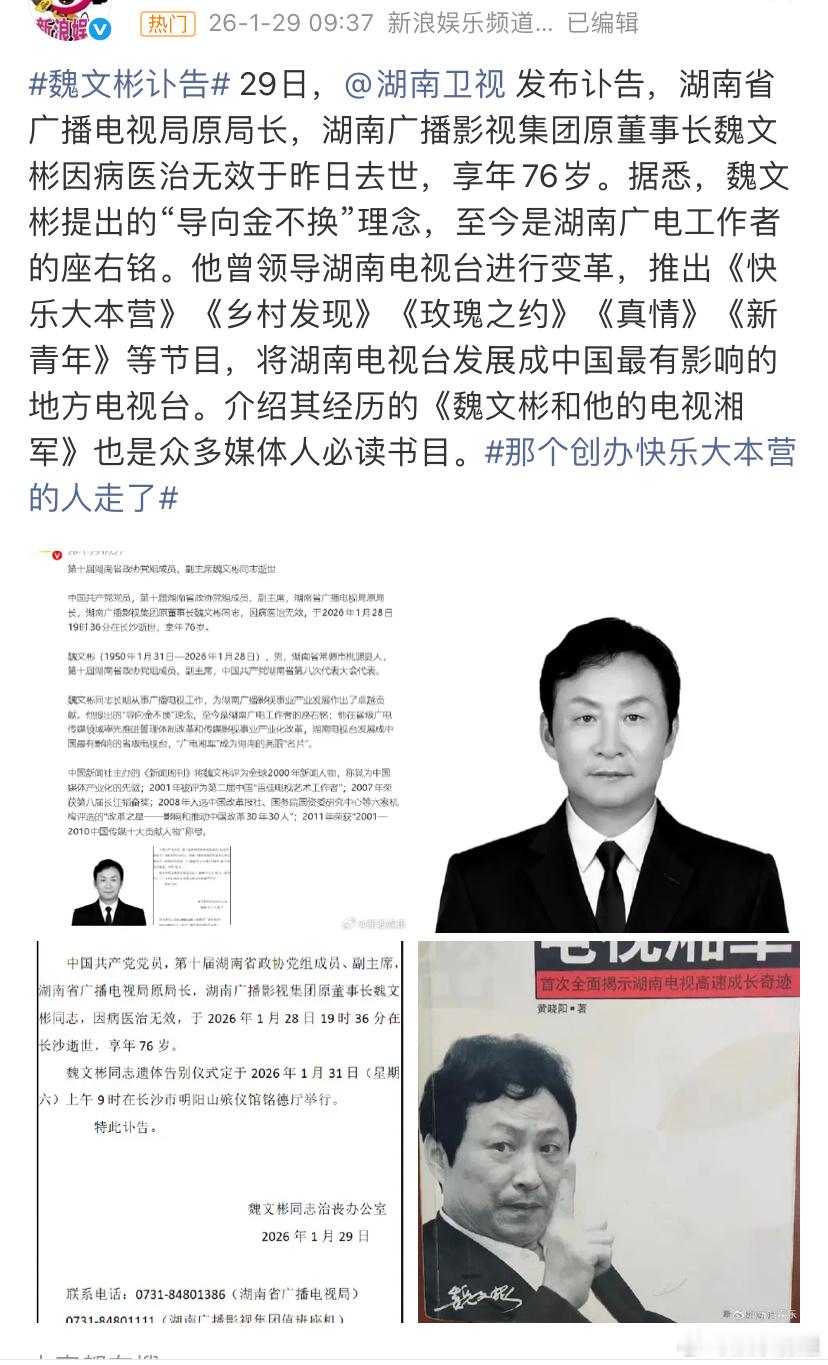 谢娜发文悼念魏文彬谢娜悼念快乐大本营创办人!逝者安息