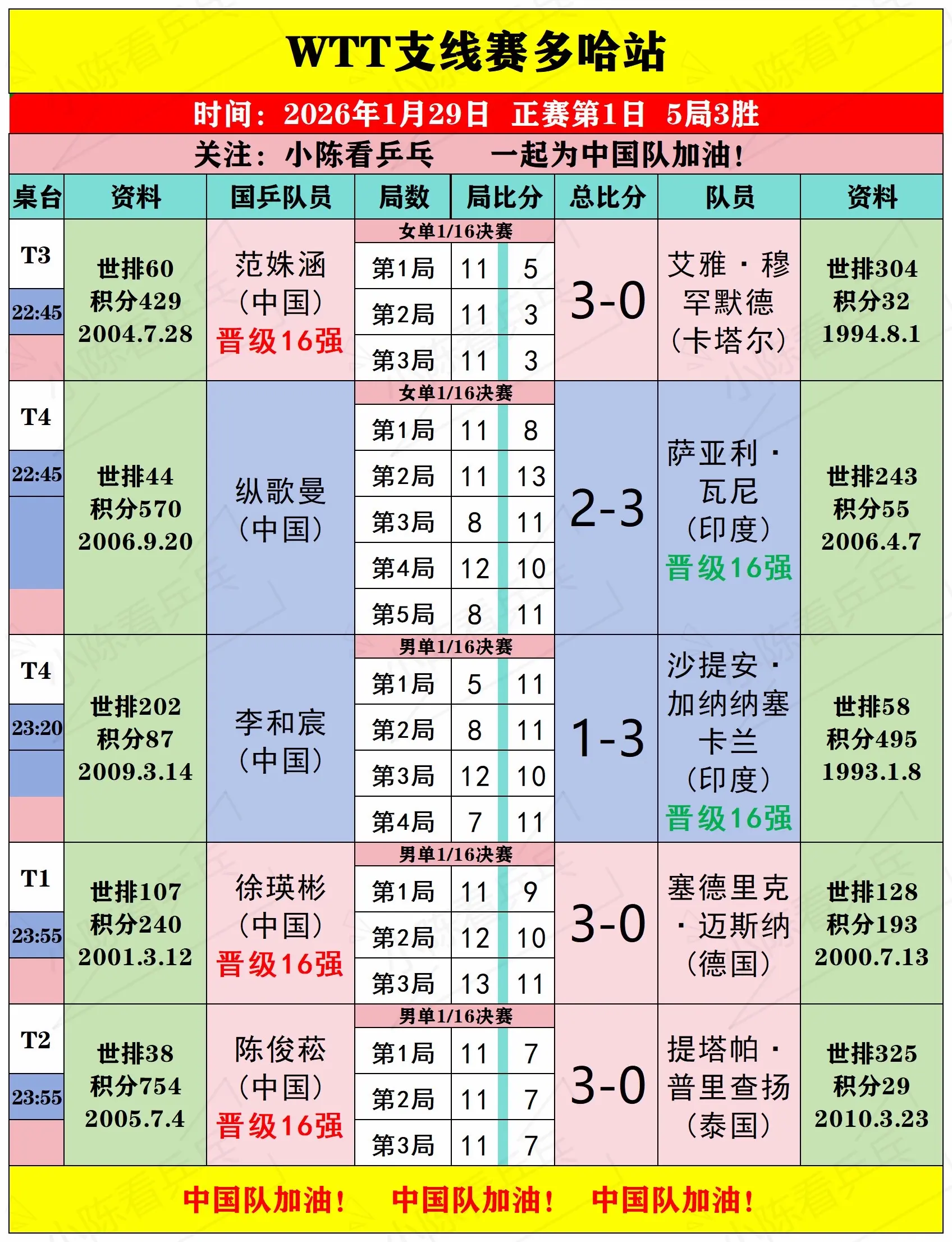 WTT多哈支线赛1月29日下半场比赛结果。WTT多哈支线赛1月29日下半场比赛结果,男女单打1/16决赛,双打1/8决赛,中国队继续加油。