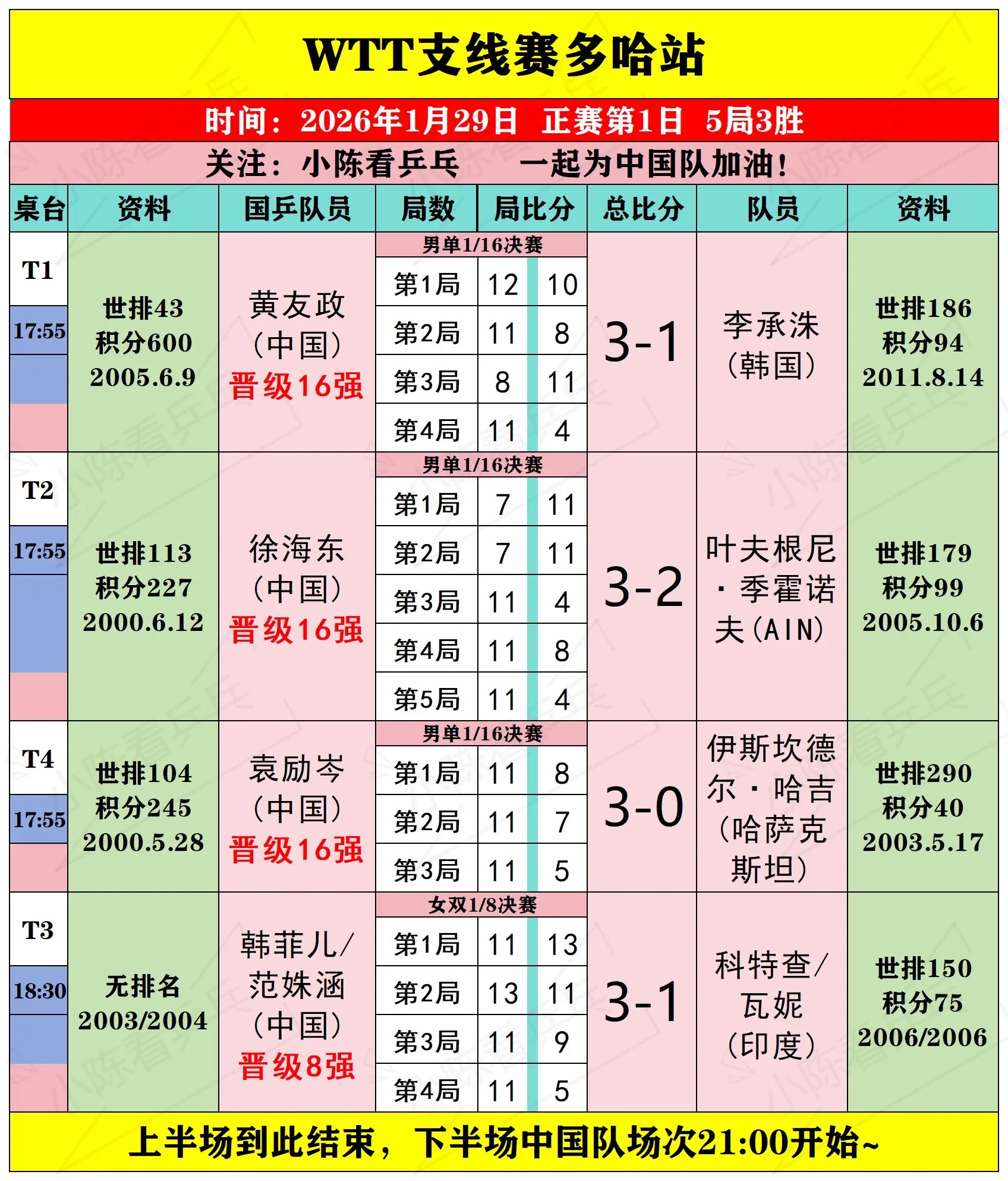 WTT多哈支线赛1月29日上半场赛况。WTT多哈支线赛1月29日上半场...