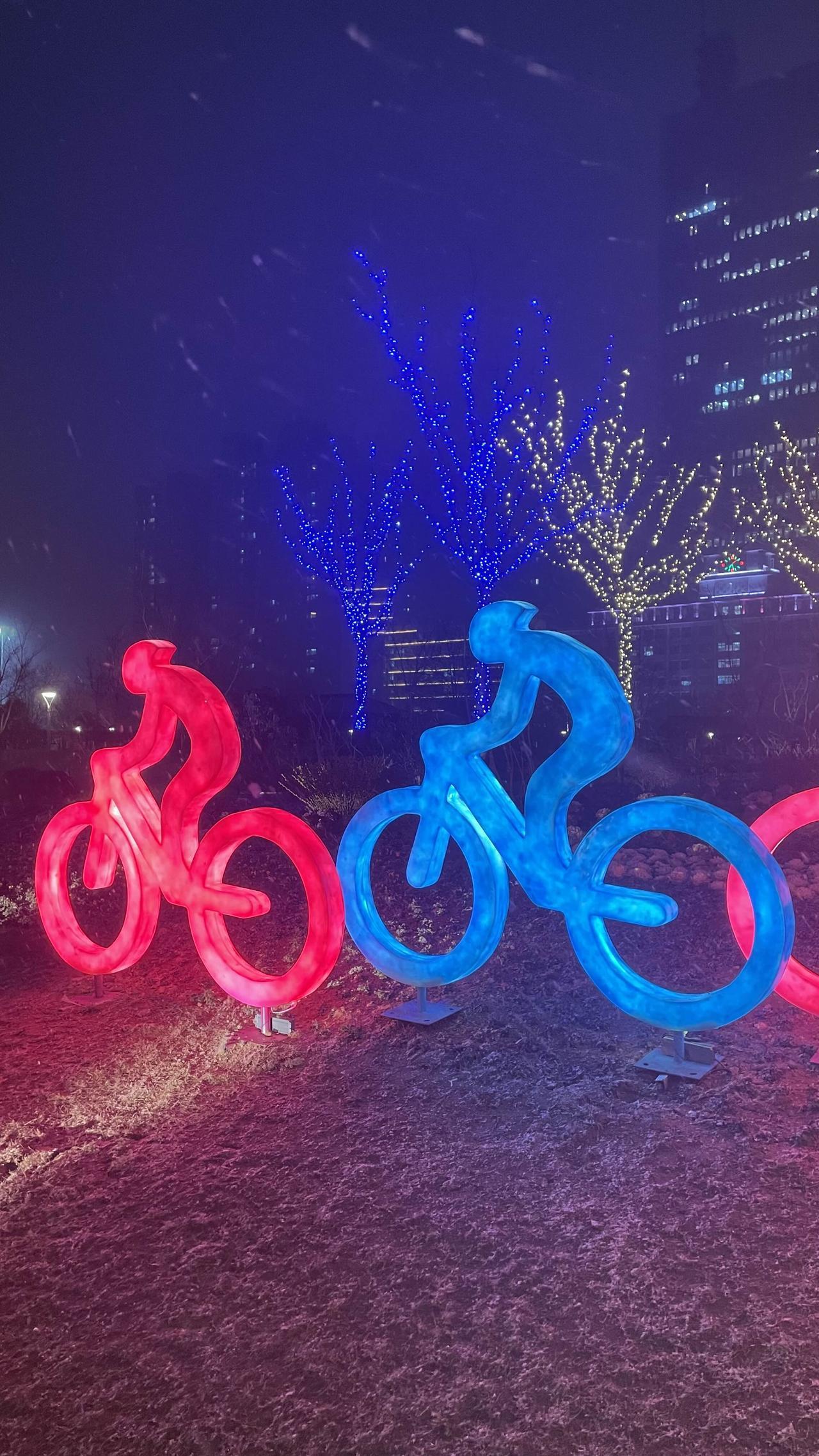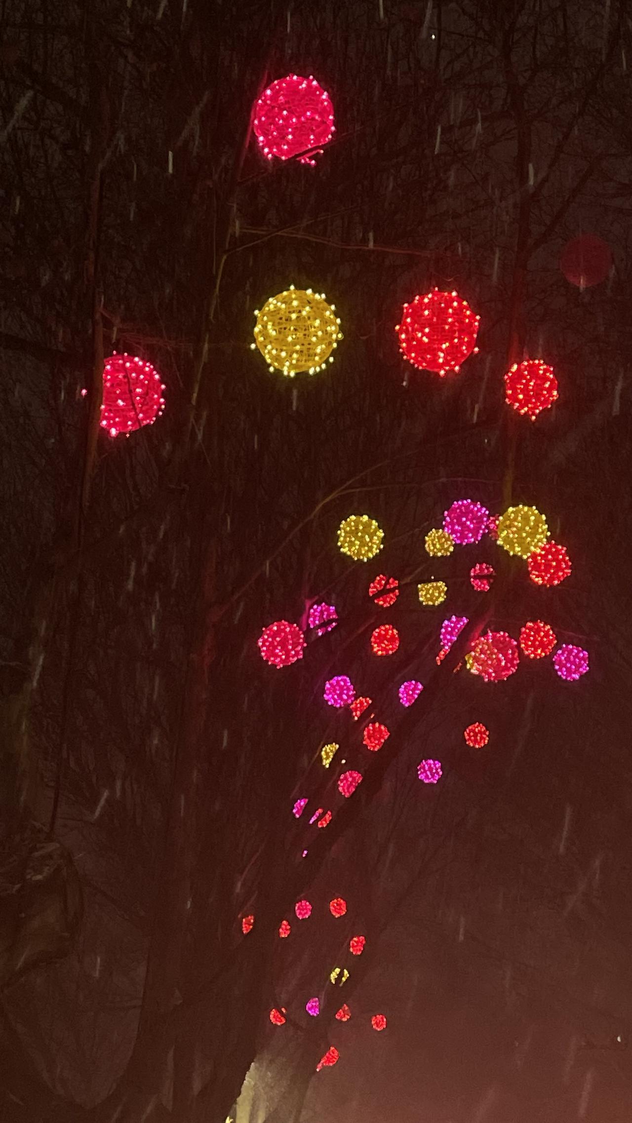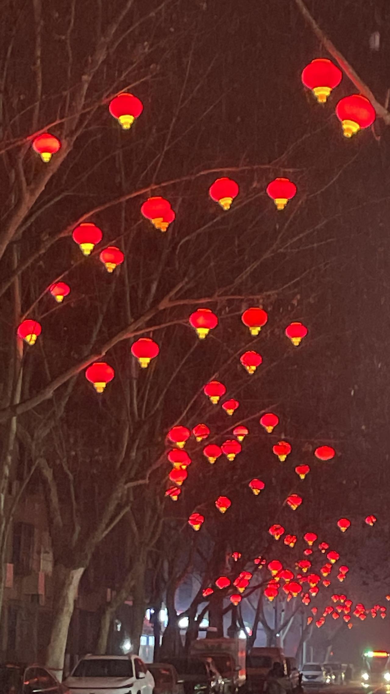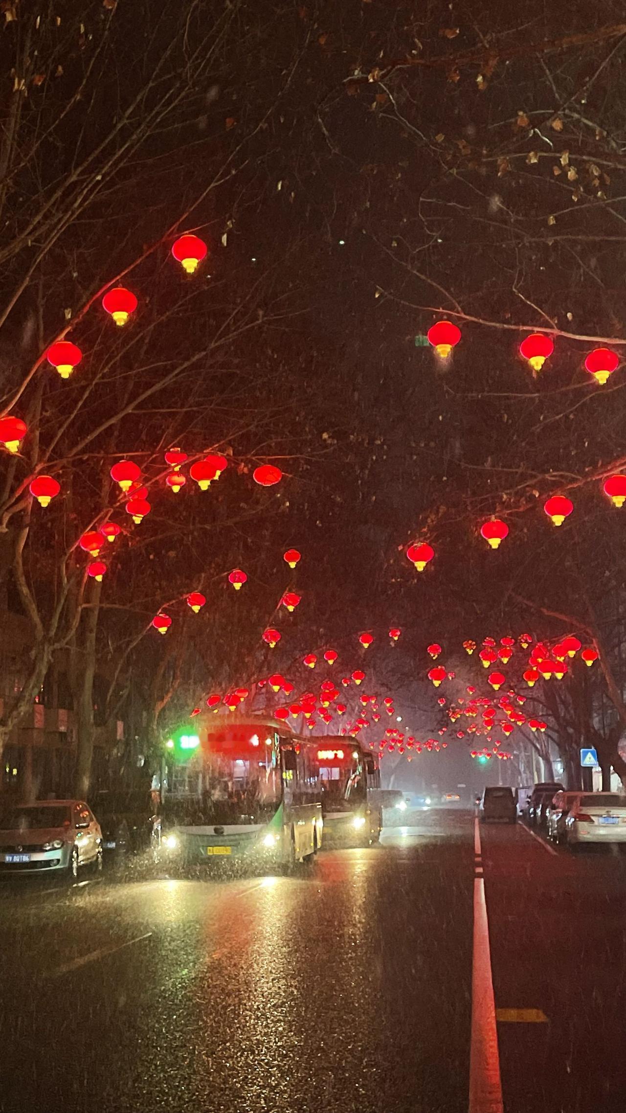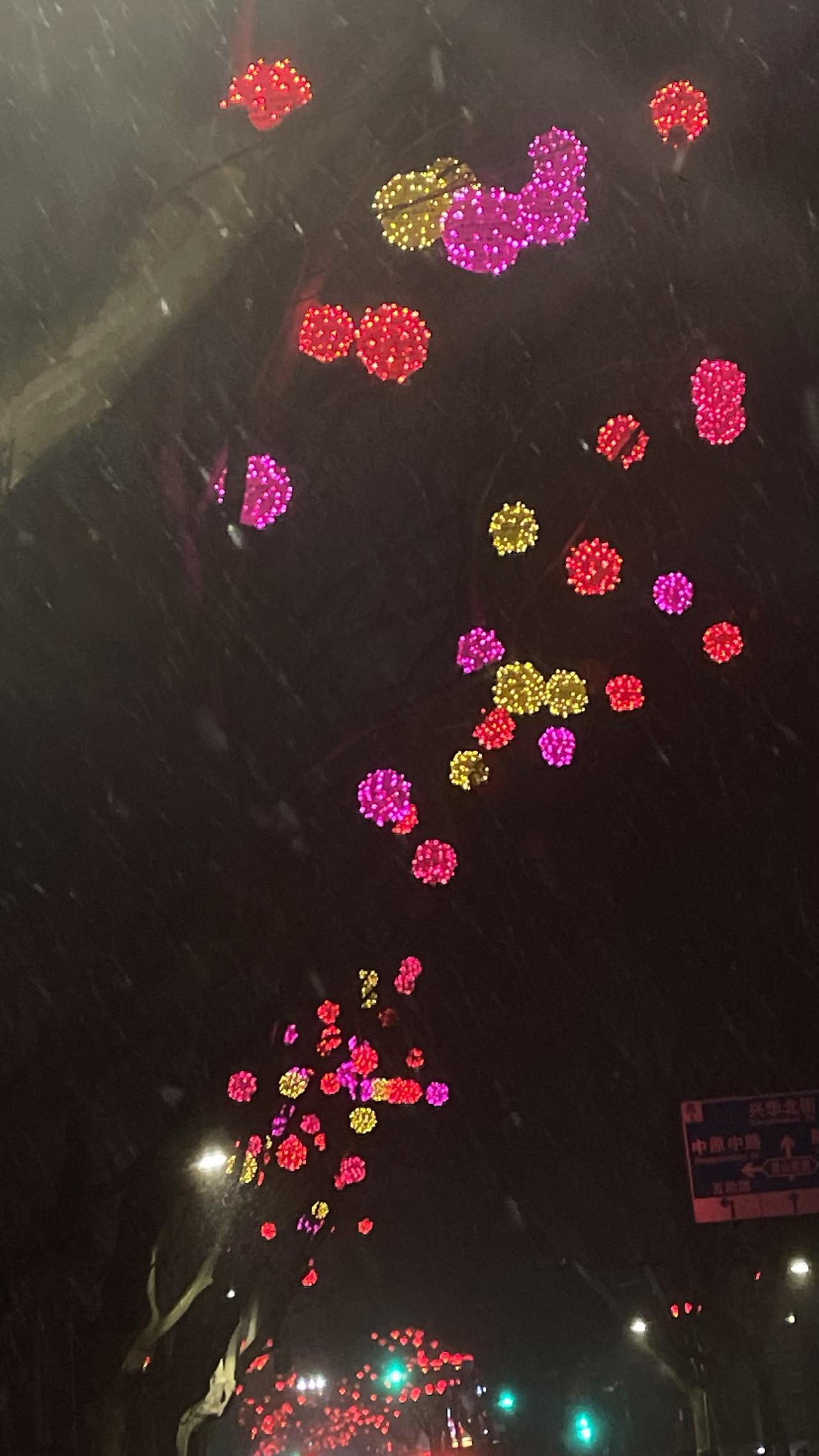 郑州突降大雪,嵩山路与伊河路,路边街头的灯笼也亮了起来,大红灯笼高高挂,五彩缤纷
