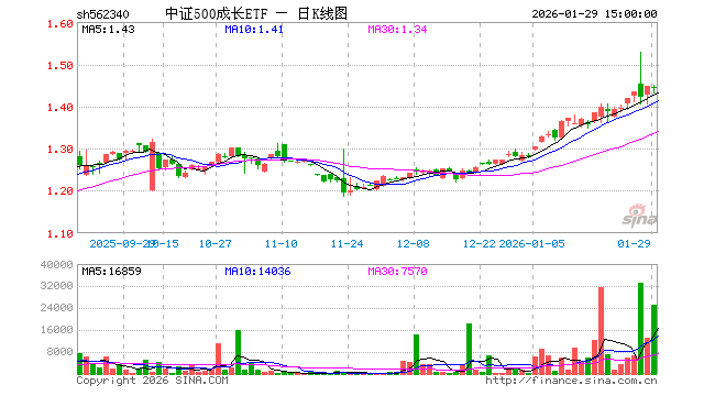 1月29日,中证500成长ETF(562340)跌0.28%,成交额364.10万元。当日份额减少100.00万份,最新份额为914.43万份,近20个交易日份额增加0.00份。最新资产净值计算值为1312.66万元。