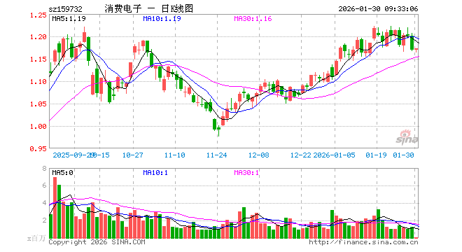1月30日,消费电子ETF(159732)开盘跌0.09%,报1.169元。消费电子ETF(159732)重仓股方面,立讯精密开盘跌0.54%,胜宏科技跌0.66%,京东方A跌0.45%,兆易创新涨2.44%,东山精密跌2.21%,豪威集团跌0.30%,TCL科技跌0.40%,歌尔股份跌0.54%,蓝思科技跌1.44%,三环集团跌0.32%。