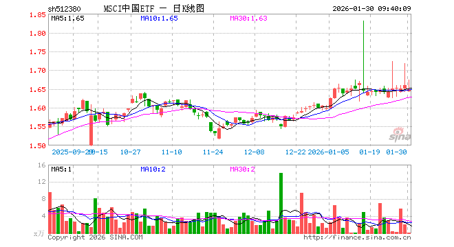 1月30日,MSCI中国ETF(512380)开盘跌0.96%,报1.644元。MSCI中国ETF(512380)重仓股方面,贵州茅台开盘跌0.19%,宁德时代涨1.90%,招商银行涨0.00%,工业富联跌1.04%,中国平安涨0.01%,紫金矿业跌5.18%,长江电力涨0.04%,中际旭创涨0.38%,农业银行涨0.00%,寒武纪跌0.00%。