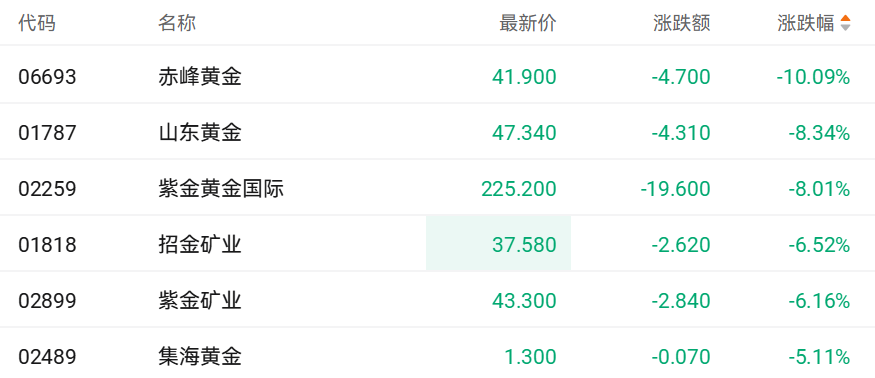 截至发稿,赤峰黄金(06693.HK)跌10.09%、山东黄金(01787.HK)跌8.34%、紫金黄金国际(02259.HK)跌8.10%、招金矿业(01818.HK)跌6.52%。