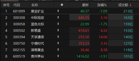 紫金矿业成交额突破200亿元 贵州茅台突破100亿元