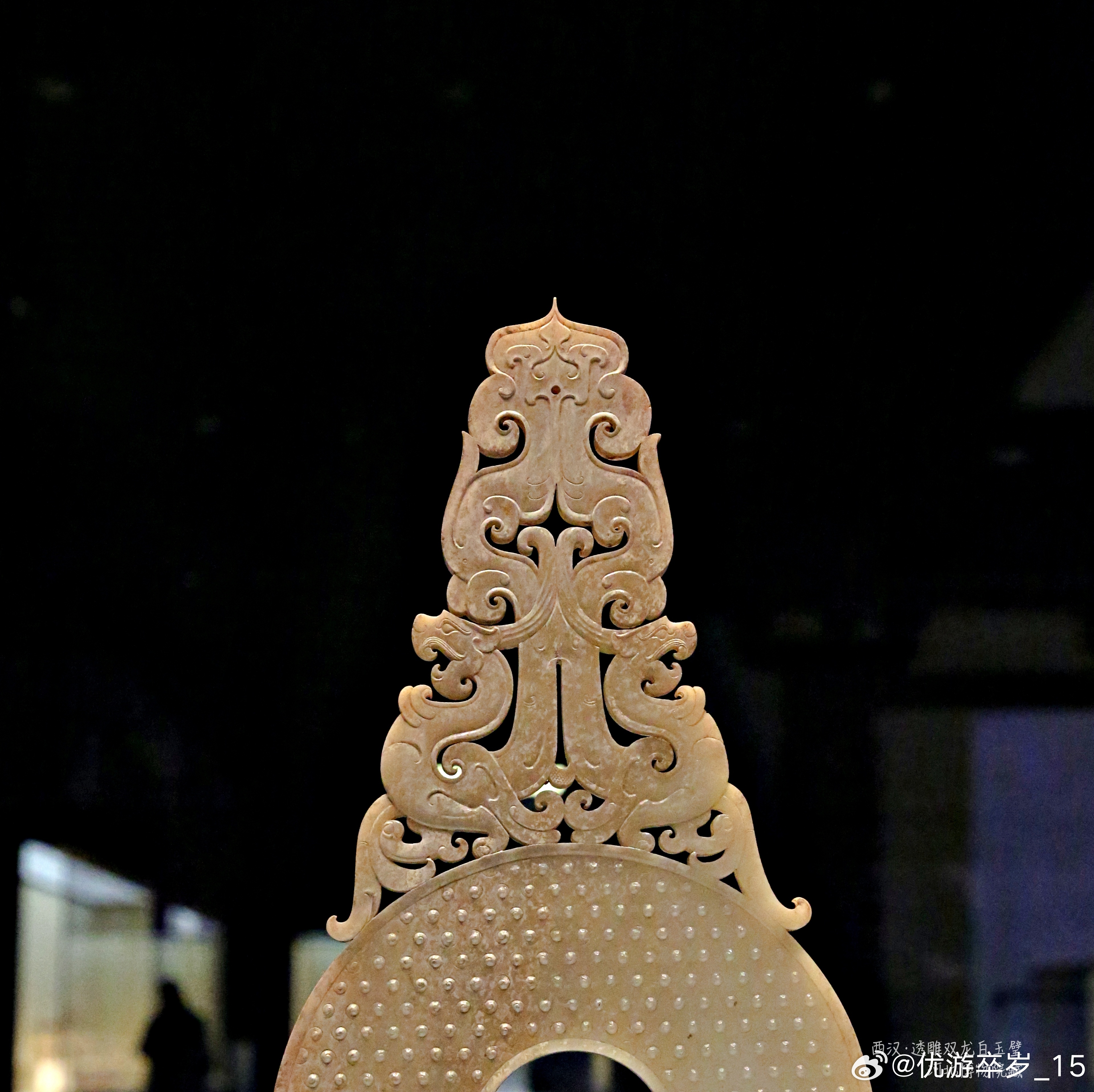透雕双龙白玉璧西汉 (公元前202年-公元8年)河北博物院藏1968年出土于河北保定满城西汉中山靖王刘胜墓。玉璧通高25.9厘米 外径13.4厘米。玉质晶莹洁白,两面雕刻细密的谷纹,周缘起棱,璧的上端饰透雕双龙卷云纹钮,双龙相背,昂首曲身,张口挺立在壁缘上,体态丰腴矫健。自龙尾部腾起对称的双股卷云纹至上端聚作一桃形顶,顶部有一小穿孔,可穿系悬挂,造型生动,优美,构思巧妙,线条流畅,雕琢精细,制作精美,为汉代玉器中之姣姣者。约会博物馆文物