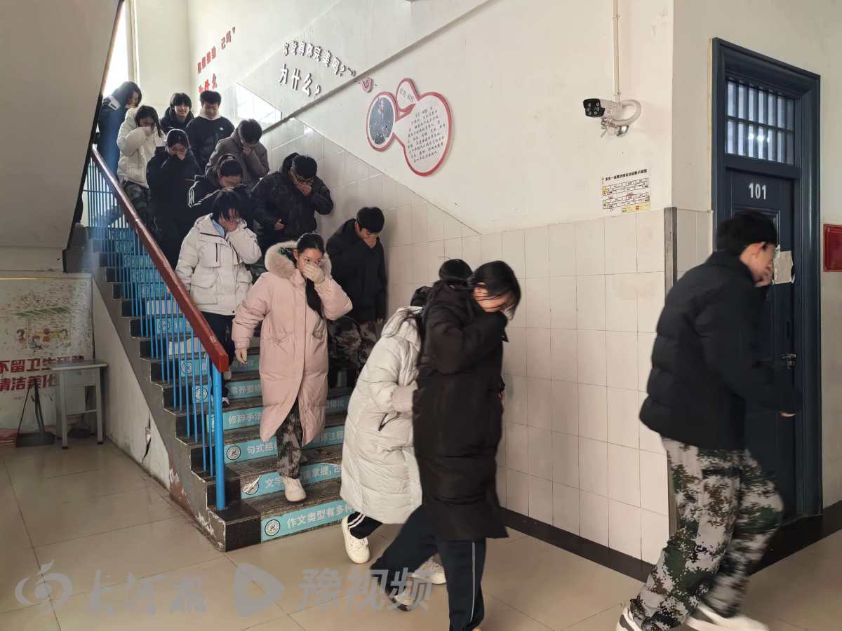 在宣传人员的引导下,同学们按照应急预案,纷纷手捂口鼻、弯着腰,沿着指定的路线开展疏散逃生演练,快速有序地撤离到学校操场安全地带。