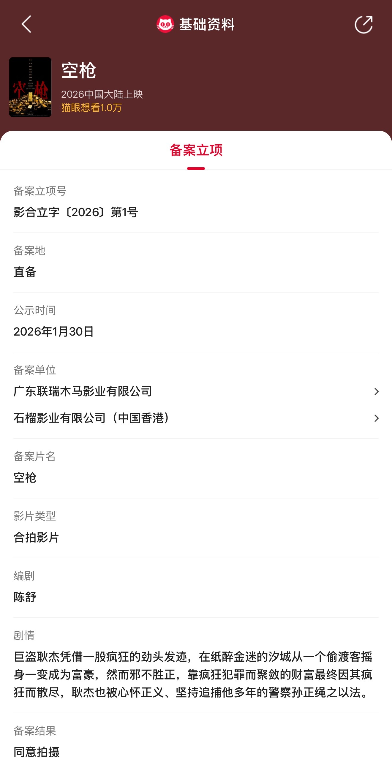 朱一龙檀健次主演空枪立项 据猫眼专业版备案立项库显示,陈舒编剧电影《空枪》备案立项,备案单位:广东联瑞木马影业有限公司、石榴影业有限公司(中国香港)。梗概:巨盗耿杰凭借一股疯狂的劲头发迹,在纸醉金迷的汐城从一个偷渡客摇身一变成为富豪,然而邪不胜正,靠疯狂犯罪而聚敛的财富最终因其疯狂而散尽,耿杰也被心怀正义、坚持追捕他多年的警察孙正绳之以法。空枪备案立项