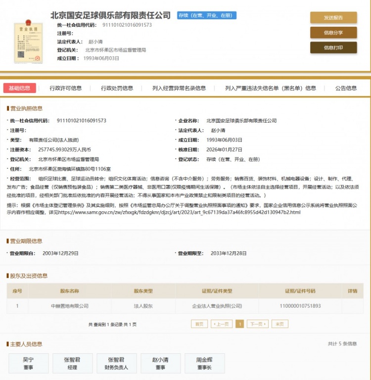 直播吧1月30日讯国家企业信用信息公示系统显示,北京国安足球俱乐部法定代表人已由李明变更为赵小清。